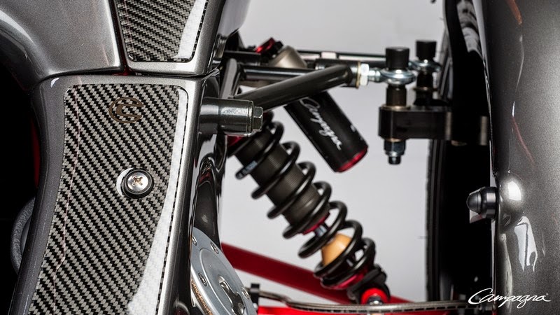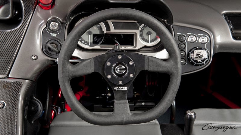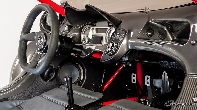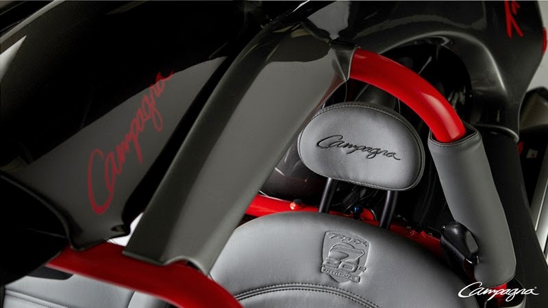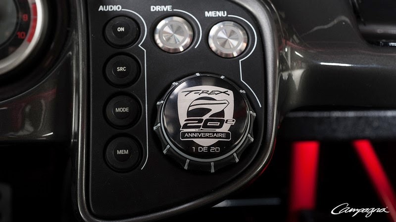 This T-REX model is a real standout with its entirely red chassis, bodywork with distinctive two-tone design, black rims, leather-wrapped steering wheel and an authentic Campagna "carbon kit". The T-REX 20th anniversary commemorative logo (in French in recognition of its Quebec roots) is permanently positioned to various key locations: laser engraved on the dashboard's multi-controller button, on a special motor plate and embossed in the custom leather seats.