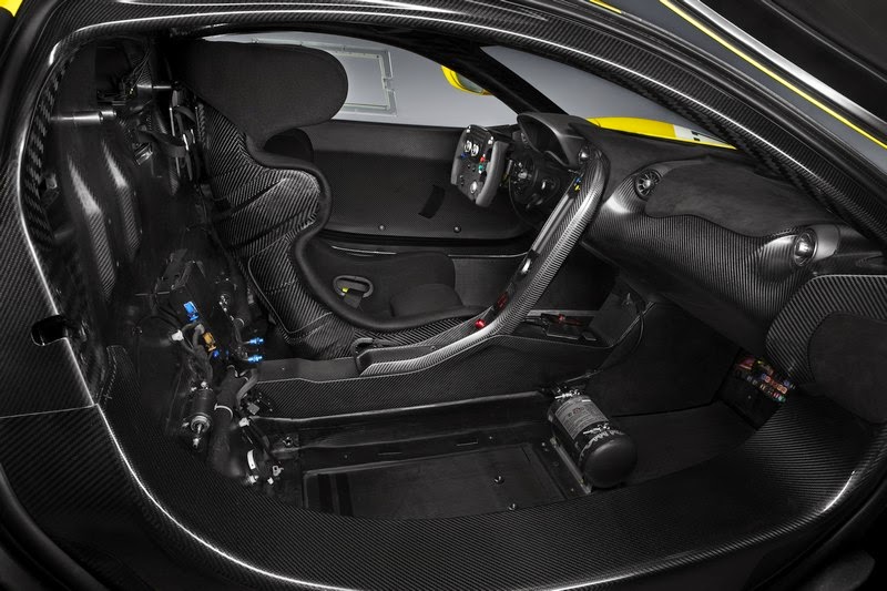 the rear of the track-only model is dominated, in contrast to the road-going mclaren p1™, by the presence of a fixed-height wing which sits more than 400mm above the sculpted rear bodywork – an increase of over 100mm of the adjustable wing on the road car. working in conjunction with the front-mounted aerodynamic flaps ahead of the front wheels, the rear wing helps to increase downforce levels by more than 10 percent – meaning up to 660kg at 150 mph. mounted on light weight carbon fibre pylon supports, the wing retains the drs (drag reduction system) of the road car, which trims the pitch from 32° to 0° at the push of the button on the steering wheel. another bold and differentiating feature at the rear are the large twin exhaust pipes, formed from an inconel and titanium alloy. this system saves in excess of 6.5kg over the already light road-going system.