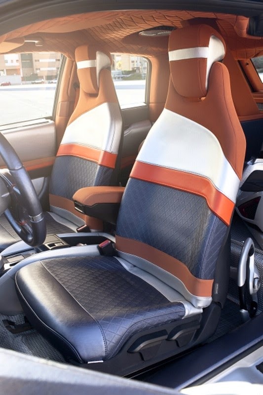 the fact that electric vehicles can also be sexy and emotionally charged - in rinspeed’s view even have to be in order to sell better - is proven by “budii’s” bright anthracite paint finish with sparkler effect. in the interior, designed jointly by hornschuch and strähle+hess, silver-colored and midnight-blue “skai” surfaces as well as the cognac-colored textile with signal-orange highlights in edging and band create a feel-good lounge atmosphere. the floor carpets and floor mats were supplied by racemark industries, the innovative rear shelf made from thermoplastics by schoeller spinning group. the finishing touches for the entire interior decoration were added by the firm of mansory. removable plexiglas worktables allow relaxed working during autonomous driving.