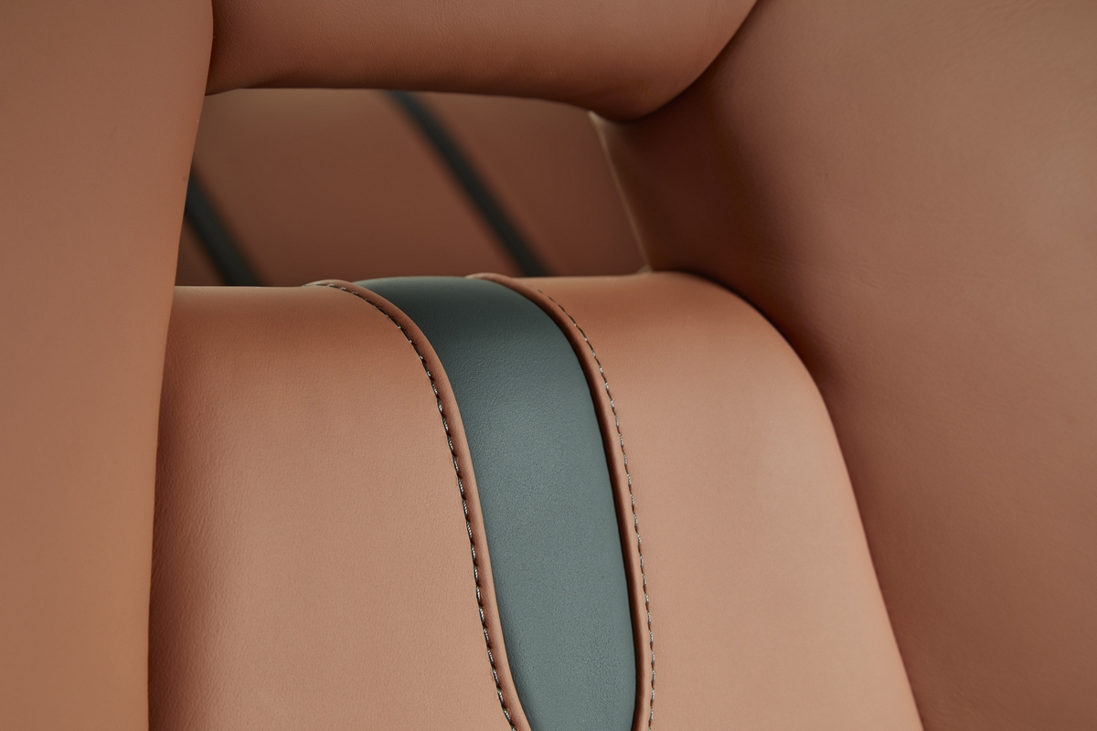 the exterior of the car is adorned with saddle tan aero pin-striping edging the front aero blades, side skirts and rear diffuser, while each door carries a stripe of the same colour that runs rearwards from a subtle union jack emblem finished in silver-grey. mso black exterior components replace the front splitter, door inserts, side air intakes, side skirts and rear bumper, diffuser and spoiler, all of which would usually be finished in dark palladium or body colour.