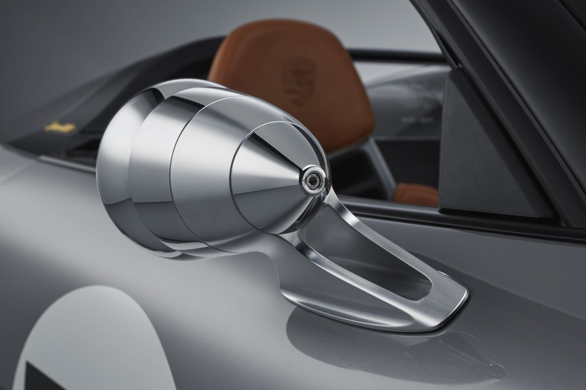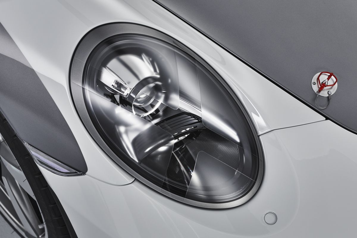 The broad body of the concept car has been borrowed from the 911 Carrera 4 Cabriolet, although the wings, front bonnet and rear cover of the concept are made of lightweight carbon-fibre composite material. The paintwork in the traditional colours of GT Silver and White harks back to Porsche’s early racing cars – as do many of the other carefully crafted details, such as the 50s-style central fuel tank cap positioned in the middle of the front bonnet, the classic Talbot shape of the exterior mirrors or the unique design of the main headlights. Transparent and opaque surfaces on the headlight covers produce a cross-like effect and are nod to a practice prevalent in Porsche’s early years in motorsport. At the time, the original headlights were taped before races to protect them against stone chipping and to prevent the glass from shattering. The wide B-pillars and the rear are decorated with milled, gold-plated Speedster lettering.