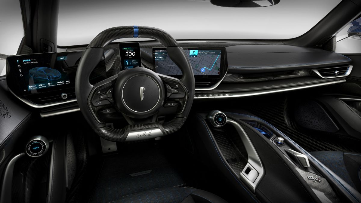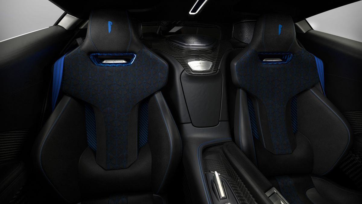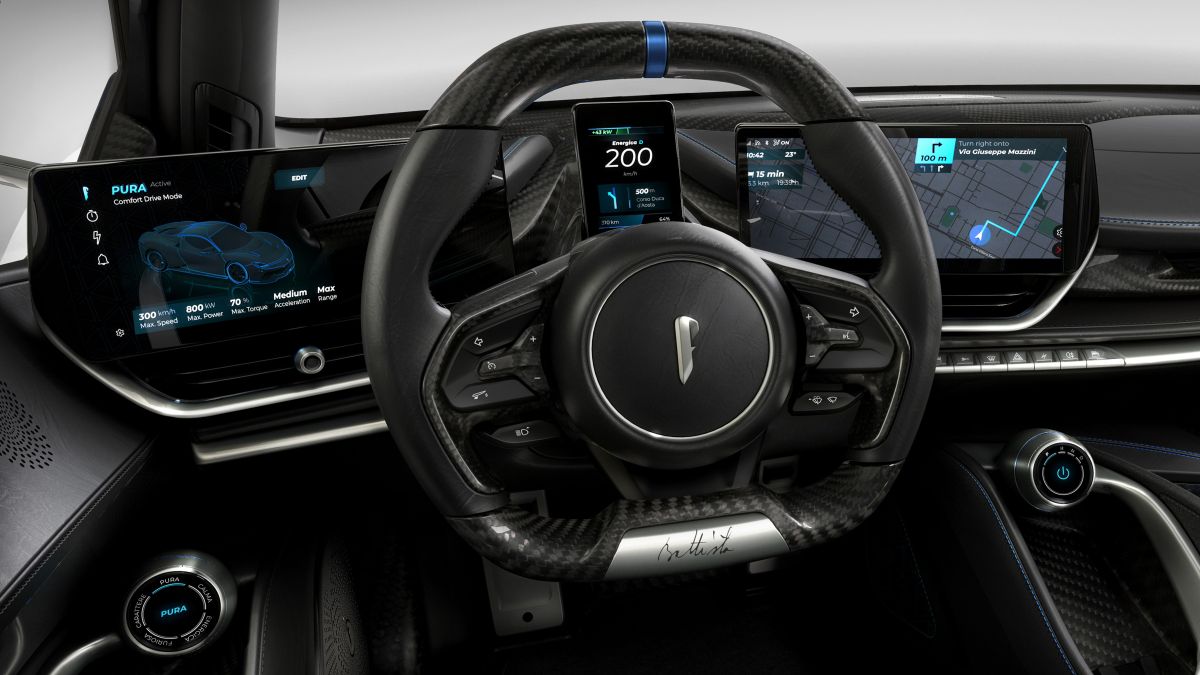 Battista Anniversario is also equipped with the 'Furiosa' package, now available to specify with any Battista, comprising a revised carbon fibre front splitter, side blades and rear diffuser. Exclusively on the Anniversario, these parts are finished in a two-tone combination of exposed signature carbon and carbon tinted in Iconica Blu with pin stripes in Bianco Sestriere. Besides the exclusive livery, a bespoke rear wing, rear aero fins and other bespoke details are unique to the Battista Anniversario. The aerodynamic enhancements enabled by the Furiosa exterior changes deliver increased downforce and greater stability at higher cornering speeds and a more dynamic balance to the car.