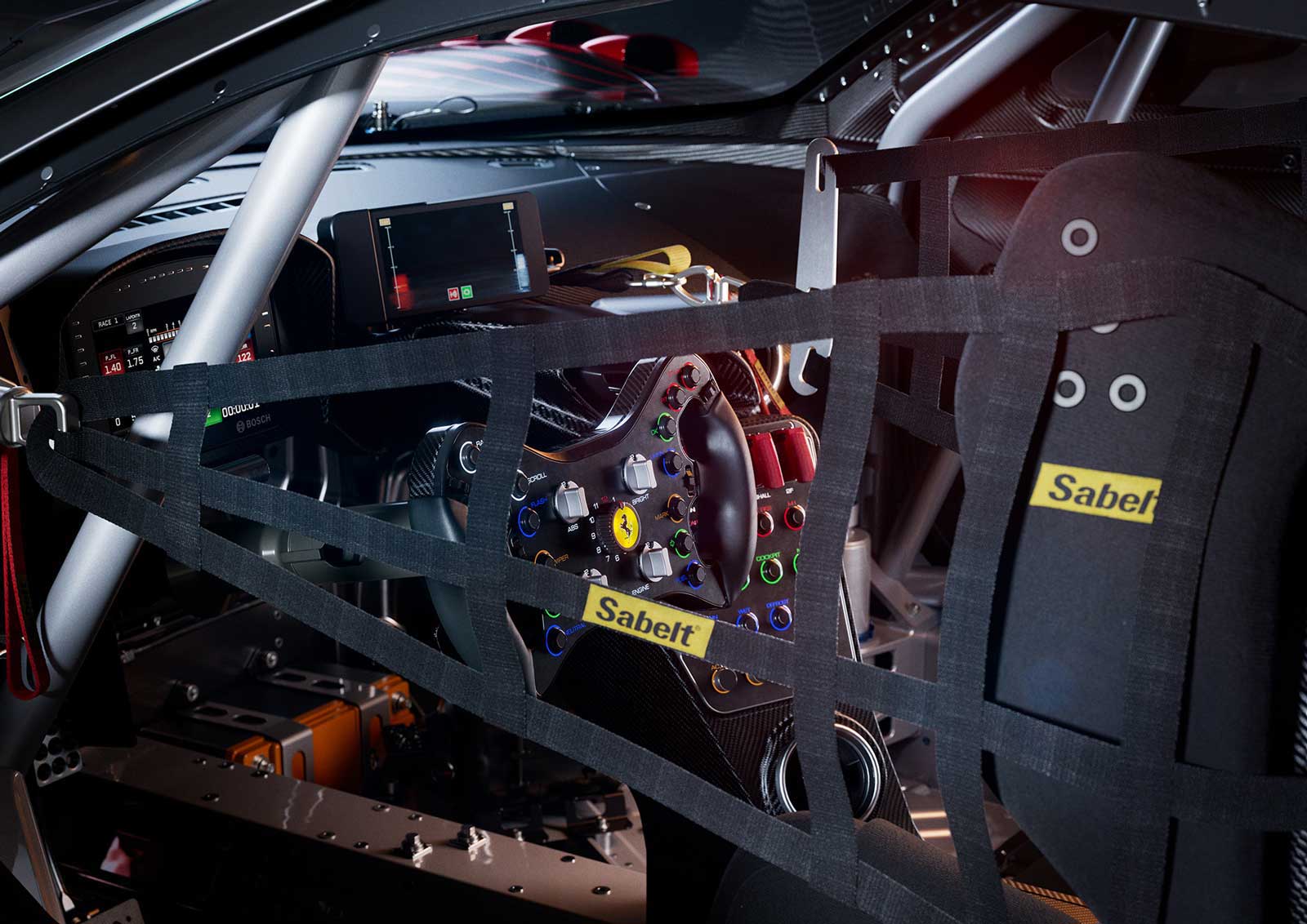 Cockpit. Intuitiveness, visibility and accessibility are critical to the development of the cabin design without neglecting essential aspects such as safety and comfort. In endurance racing, performance depends on these features, particularly for gentlemen drivers. The cabin was completely redesigned over the 488 GT3, in response to input from factory drivers and customers. The result is a cockpit that allows its occupant to quickly and effectively find the best driving position, with the main functions always within easy reach. Many controls and functions have moved to the new Formula 1 single seater-inspired steering wheel, while the position of the Sabelt seat provides optimal visibility, both day and night. It also adds a new level of comfort for drivers of different sizes and statures who can use the adjustable pedals and steering to find their best position in the car. The air conditioning system and airflow inside the cabin were designed to provide adequate ventilation in all conditions, helping the driver to concentrate during every stage of a race.