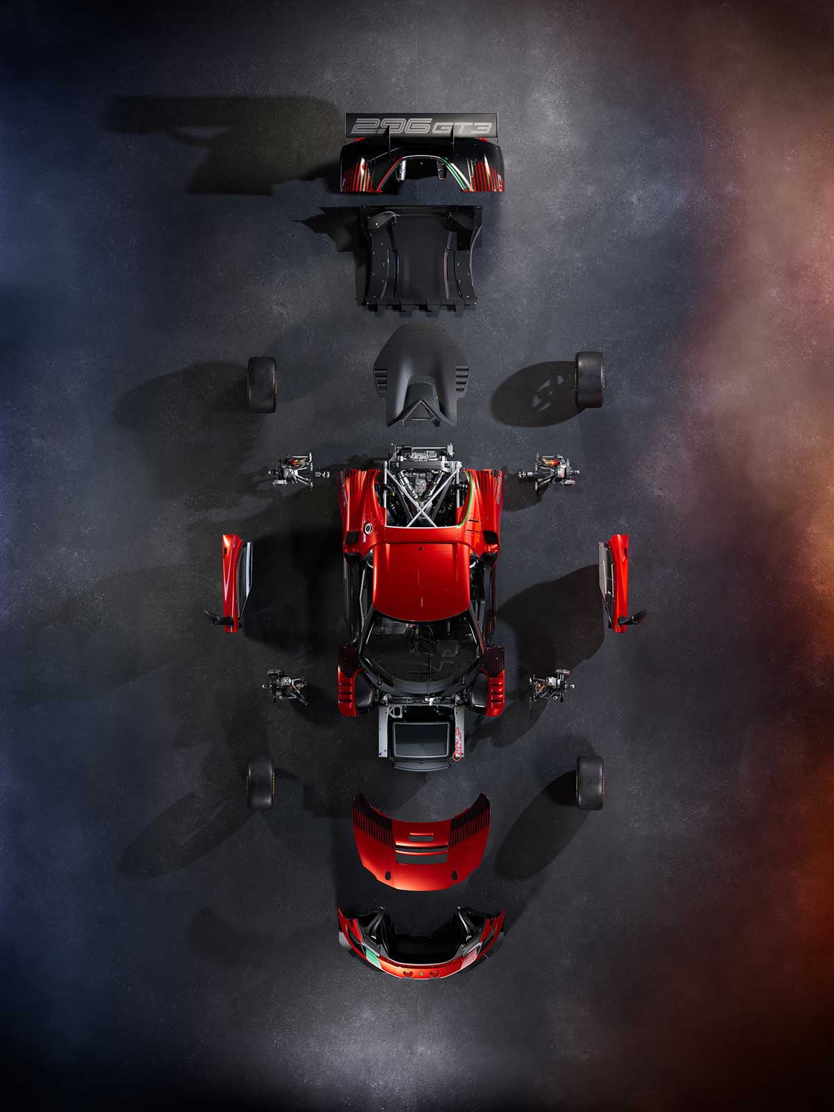 Engine and gearbox. The 296 GT3 marks the return to the track of a six-cylinder-engined Ferrari even though, in compliance with technical regulations, it doesn’t have the electric unit featured in the 296 GTB. A 120° vee configuration with equally-spaced firings was introduced for the 296 GT3’s V6 combustion engine. This is based on its road-going twin, as is the positioning of the turbos inside the vee. All this brings significant benefits in terms of compactness, lower centre of gravity and reduced mass, and also helps to achieve very high power levels. The engine, which has always been at the heart of Ferrari’s designs, is farther forward and lower down than in the road version, to the benefit of a lower centre of gravity and torsional rigidity, which is around 10% higher than in the 488 GT3.