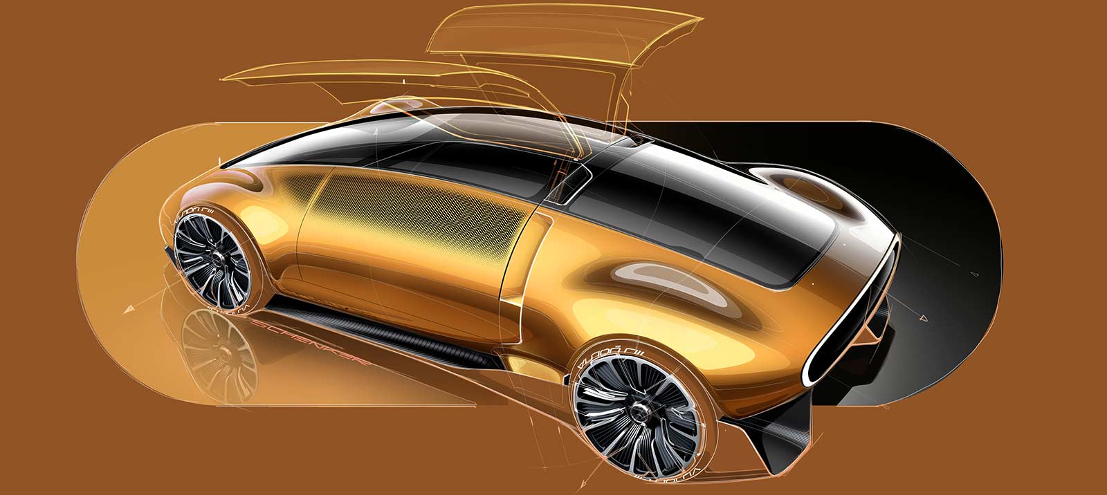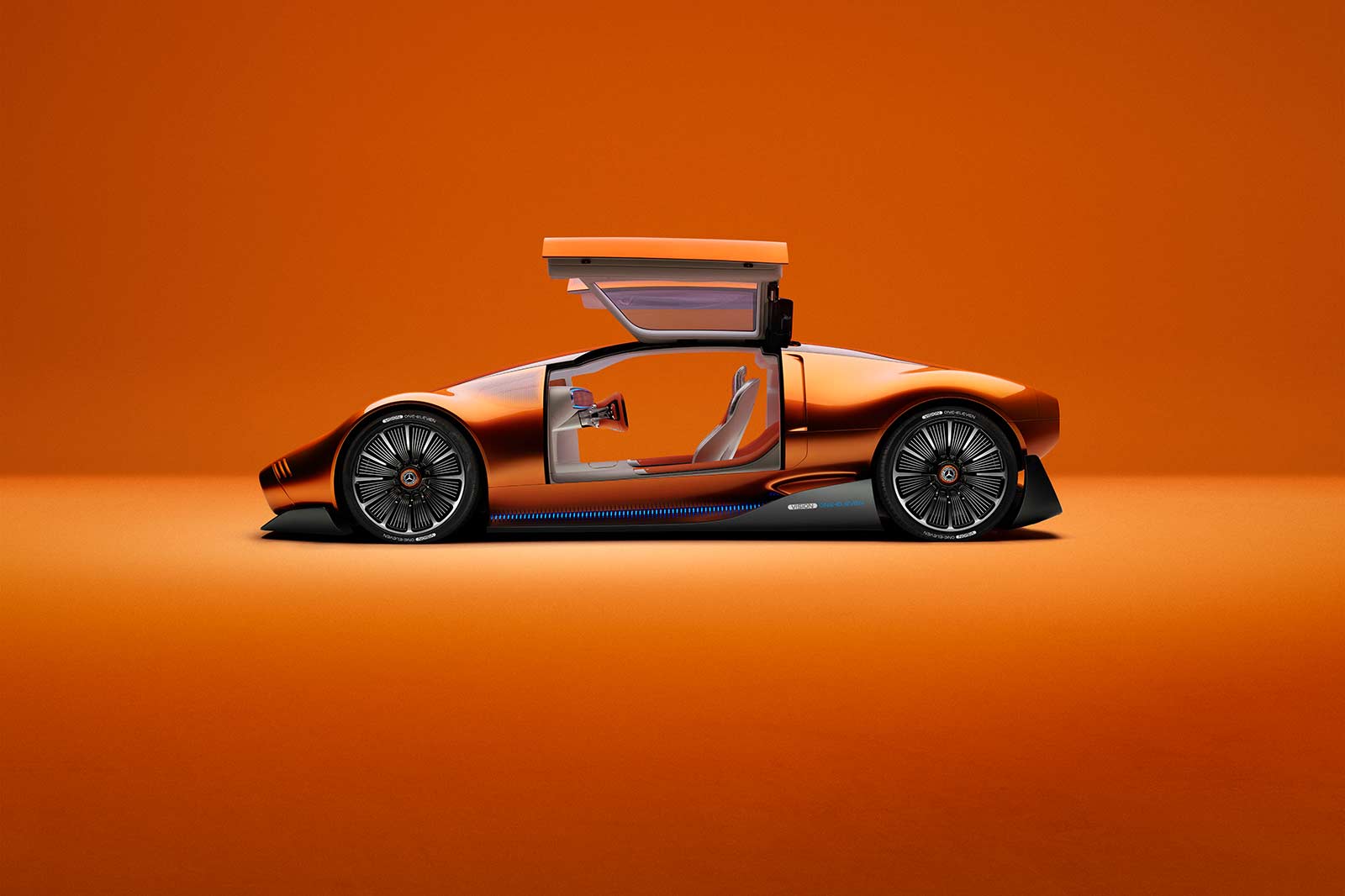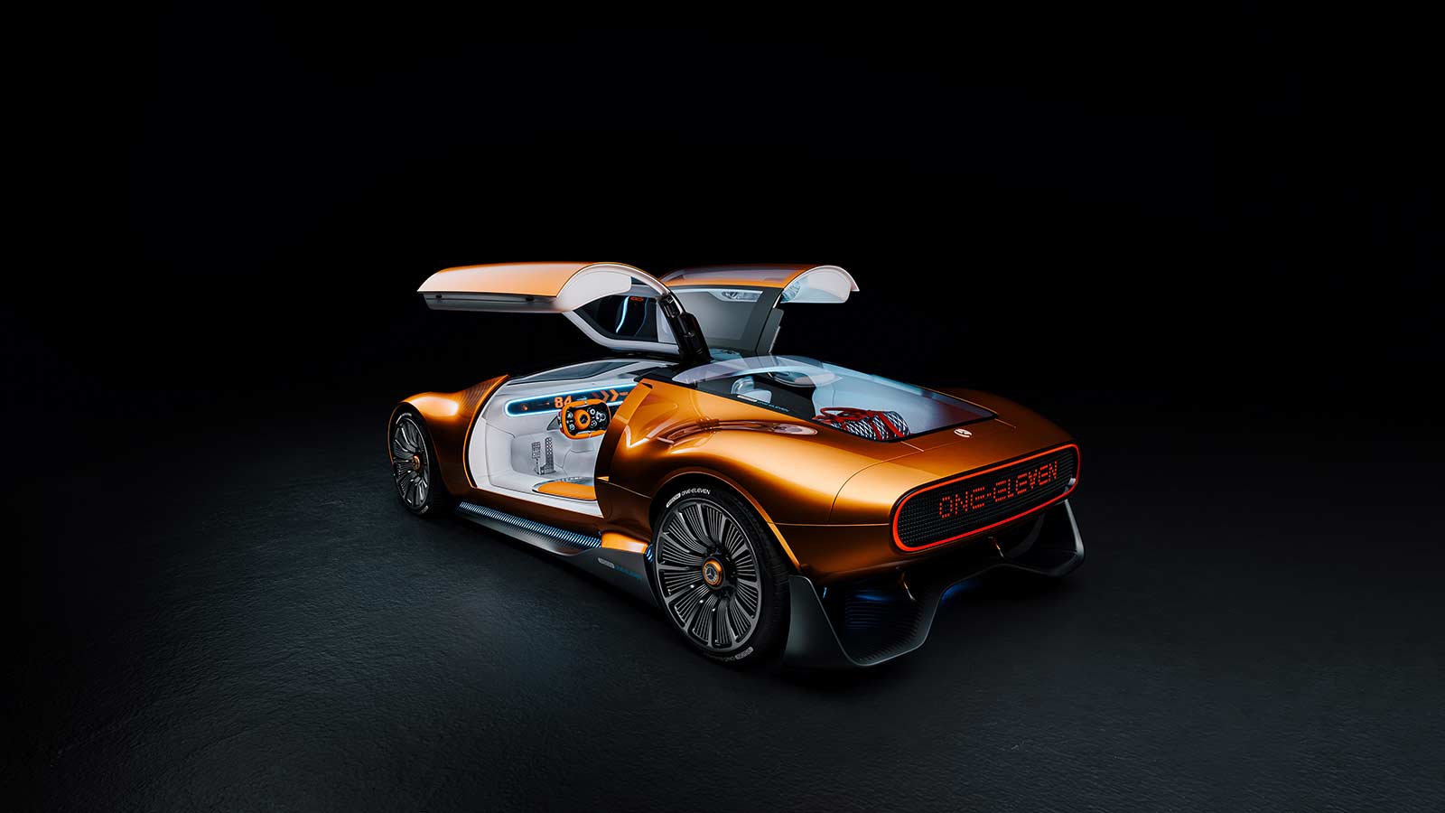 The exterior design of the Vision One-Eleven showcases the iconic One-Bow design executed with a modern twist. The smooth bow shape gives the car a sculptural feel, complemented by the copper-orange alubeam paintwork that pays homage to the C 111's distinctive color. The gullwing doors, flush-fit windows with a pixelated pattern, and large-diameter wheels seamlessly integrated into the wheel arches further enhance the sporty and aerodynamic character of the vehicle. The dark "keel line" on the lower portion of the bodyshell creates a powerful connection between the car and the road, amplifying the sense of unity with the surface.