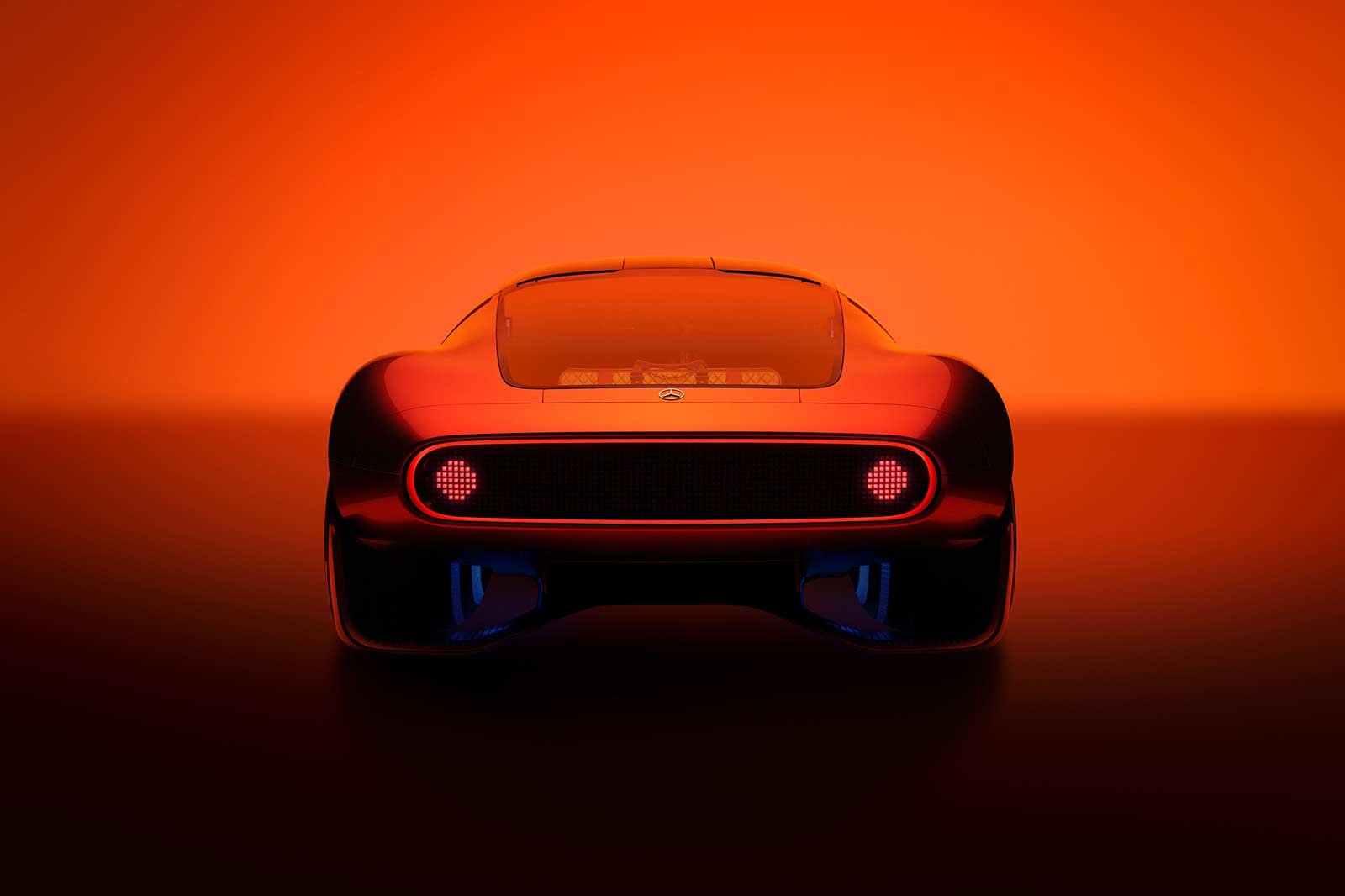 At the rear, a powerfully profiled diffuser and a display with pixelated red taillights reinforce the aerodynamic and digital elements of the design. The rear wheels feature circular lighting elements on the inner face, adding a distinctive touch.