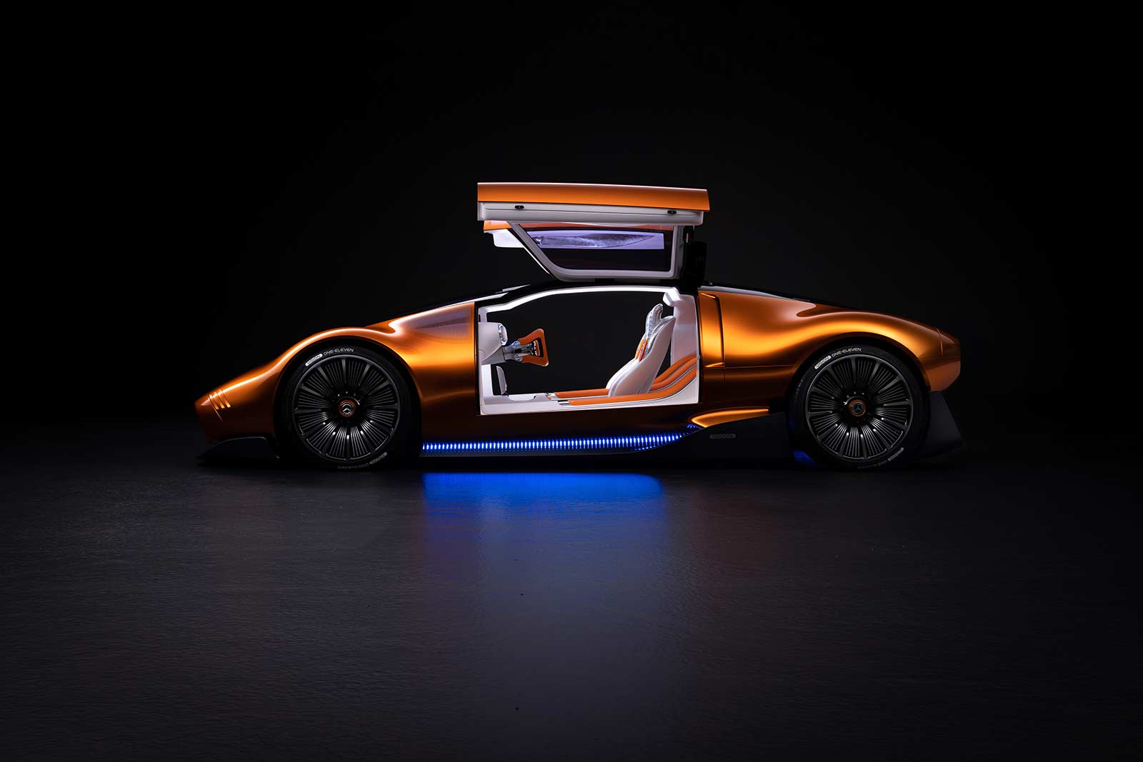 The Vision One-Eleven is powered by a cutting-edge all-electric powertrain, leveraging the expertise of YASA. The axial-flux motor delivers exceptional performance and efficiency, propelling the car with instant torque and impressive acceleration. The advanced battery technology offers a generous driving range, making long-distance journeys possible without compromising on performance. The Vision One-Eleven supports fast charging, allowing for quick replenishment of the battery when needed.