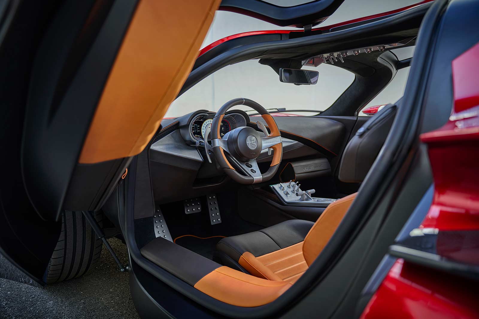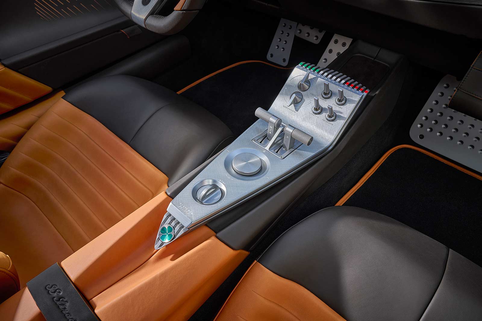 The cabin design draws inspiration from the original 33 Stradale and offers a limited number of controls on the center console. The driver's focus is directed towards a 3D telescopic display in front, which engages the driver in a unique interaction. The steering wheel, devoid of buttons, serves as the primary means of communication with the car and is adorned with aluminum shift paddles, enhancing the driving pleasure. Controls are situated at different levels, resembling an airplane cockpit, with some located on the low center console and others on a higher plane on the roof's interior.