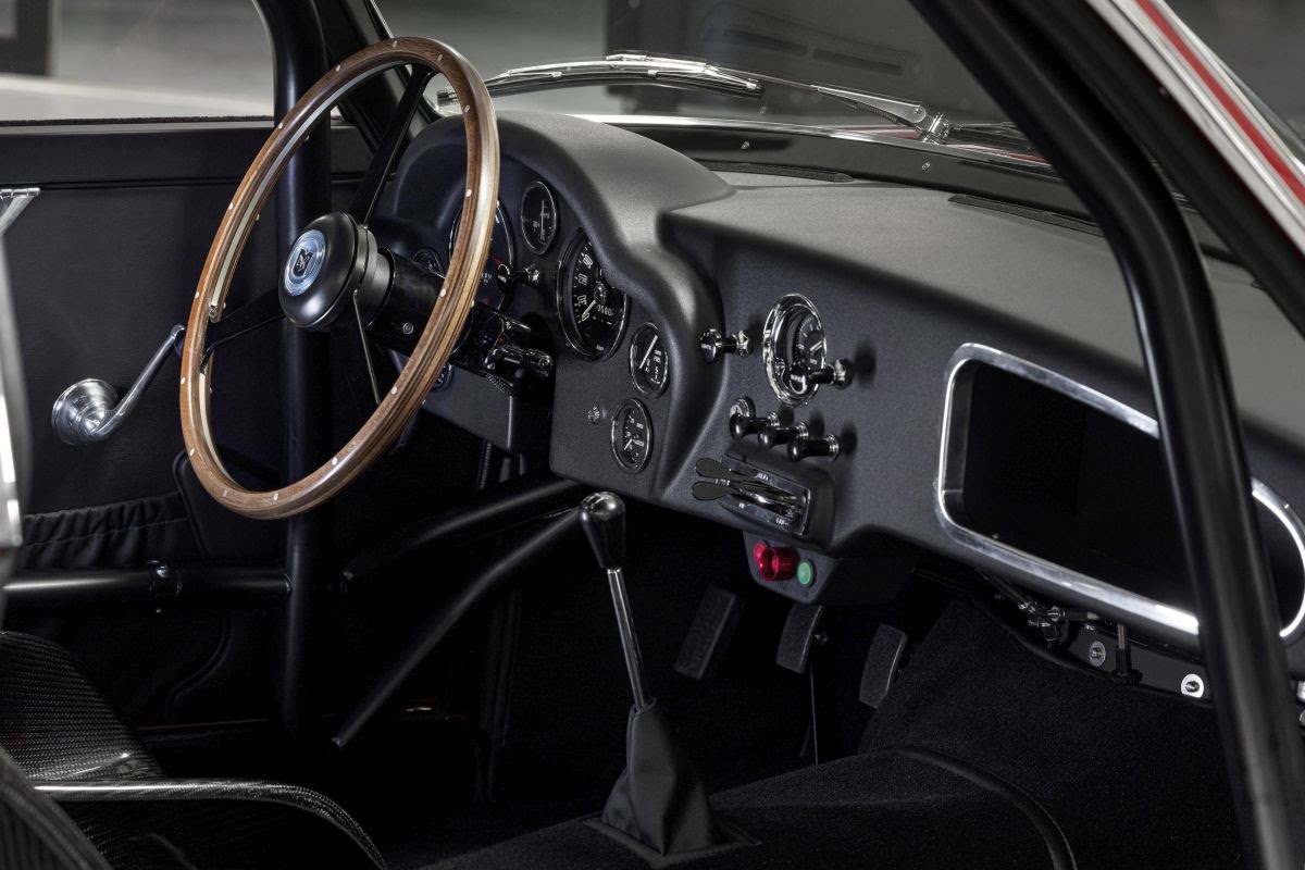Finished in Rosso Maja red paint, the car’s exterior colour has been matched to original masters created by Max Meyer & ICI, the paint suppliers for the original cars. Inside, the car is trimmed in Obsidian Black leather, which covers the pads in the carbon fibre race seats; door cards, headliner and rear environment. Black Wilton carpets bound in Obsidian Black leather trim cover the floor, stitched in matching Obsidian Black thread.