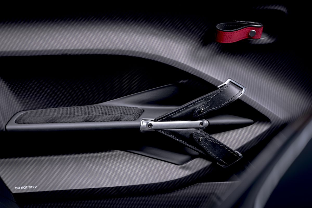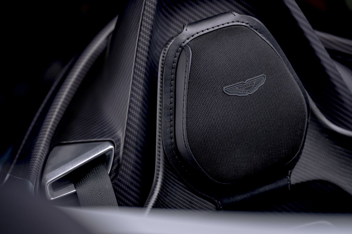 The interior specification pushes new boundaries, using a mix of traditional and modern materials. Structural satin carbon fibre, contrasts with traditional hand-crafted Saddle Leather, chrome, aluminium and even 3D printed rubber. Visually and physically the interior reduces mass, for a leaner, efficient style, but one that retains all the emotion and craftsmanship Aston Martins are renowned for. In front of the passenger is a removable leather bag in place of a traditional glove box, while there's additional storage space under the rear bumps for luggage.