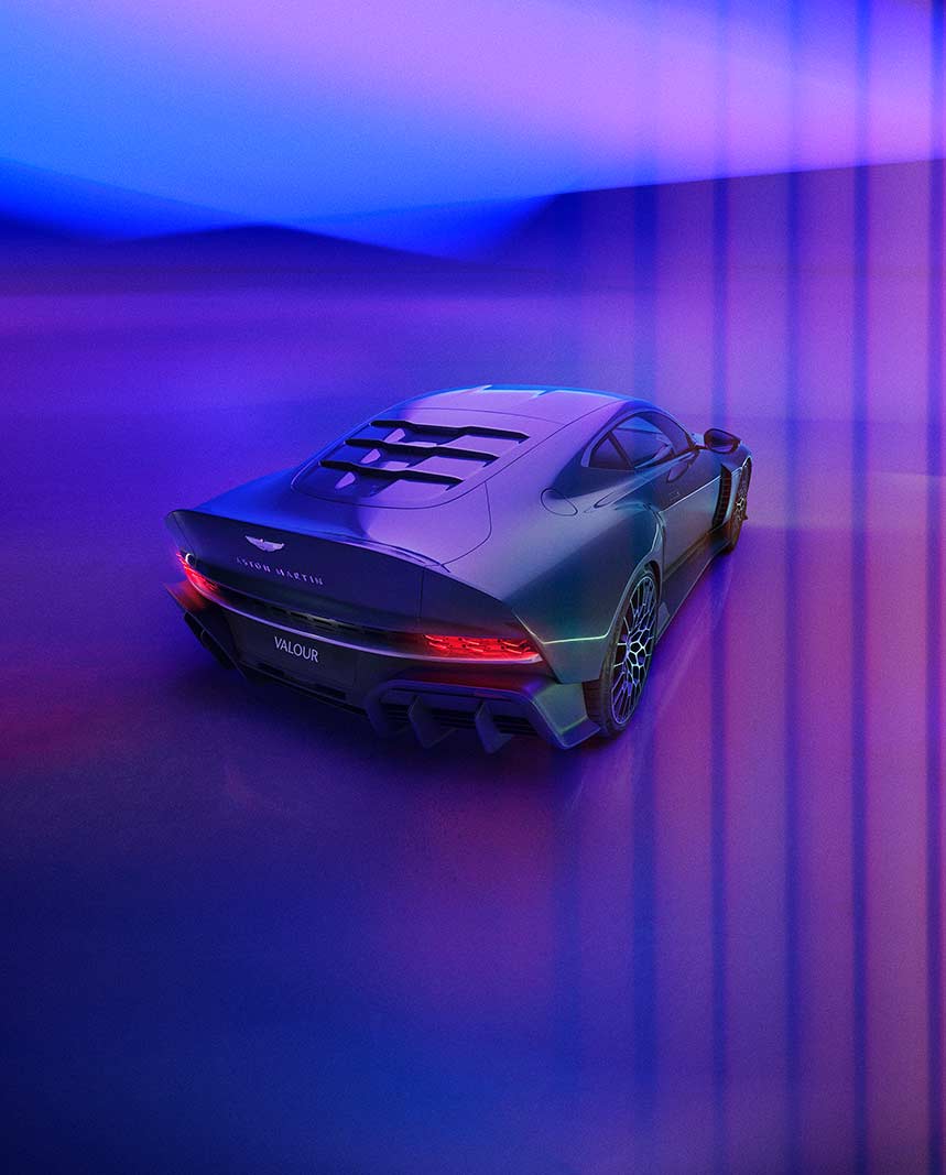 The exterior design of Valour combines Aston Martin's contemporary design language with cues from the iconic V8 Vantage. The carbon fiber bodywork is aerodynamically optimized, with a prominent front splitter, fender vents, and a rear diffuser that enhance stability and balance. The rear design features Valkyrie-inspired LED tail lights and a triple tailpipe exhaust system.