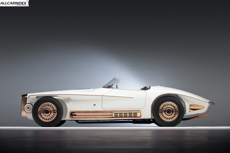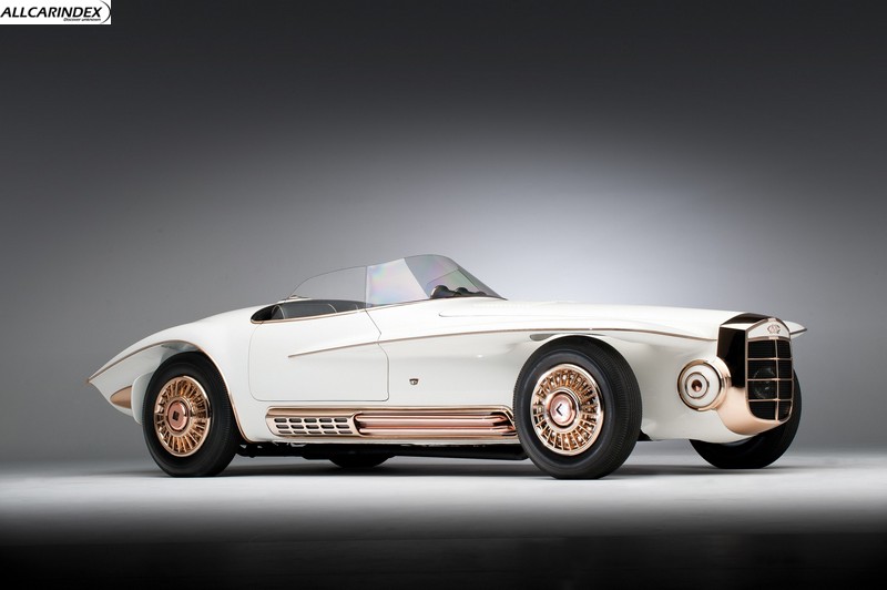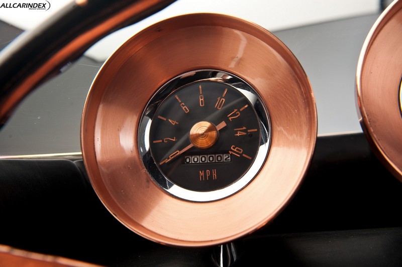 the copper development association’s mercer-cobra exploited the dramatic colors and textures of copper and copper-based materials to its advantage, particularly with the brass-era theme of the mercer. some eleven different materials, alloys and finishes were employed in both the interior and exterior to demonstrate the diversity of copper and brass. exner’s design emphasizes the long hood and pushed-back passenger compartment with long blade-style front fenders open along the hood sides, abbreviated rear fenders with separate mudguards behind the rear wheels and a long, tapered rear deck. a classic-style brass grille with eight large elements in front of mesh stone guards proudly leads the mercer-cobra’s design statement. the headlights are ingeniously mounted on pivots where they swing back flush with the sides of the nose when not illuminated. exner later observed, “our overall aim was to create an interesting and stimulating design rather than one which simply follows the ‘formula’ of a flat, low snout with a horizontal air scoop and a squared-off bobtailed rear.”