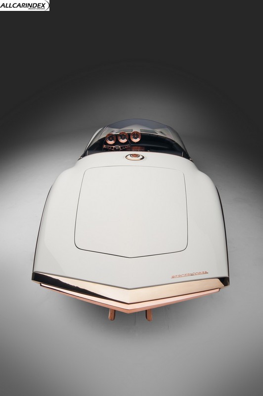 for practical purposes, brass and copper elements were covered with an acrylic coating to prevent discoloration and exterior moldings made of silicon bronze. the taillights are recessed in brass tunnels integrated with the rear-wheel mudguards. interior trim, seat backs, door panels and dashboard gauges are executed in copper while a high-strength chromium-copper alloy is used in the steering-wheel spokes. the 16-inch wire wheels have multi-piece brass covers. chrome plating is used deftly but sparingly throughout, mostly on a brass substrate, to accent the richness of the brass and copper elements. the engine has been given the brass and copper treatment on the valve covers, air cleaner, oil filler cap and dipstick housing. this treatment continues in the silicon bronze heat shield protecting the body and passengers’ legs from the chrome-plated side exhaust pipes. even the brake discs are made from copper alloy where the high heat-transfer rate promotes exceptional performance.