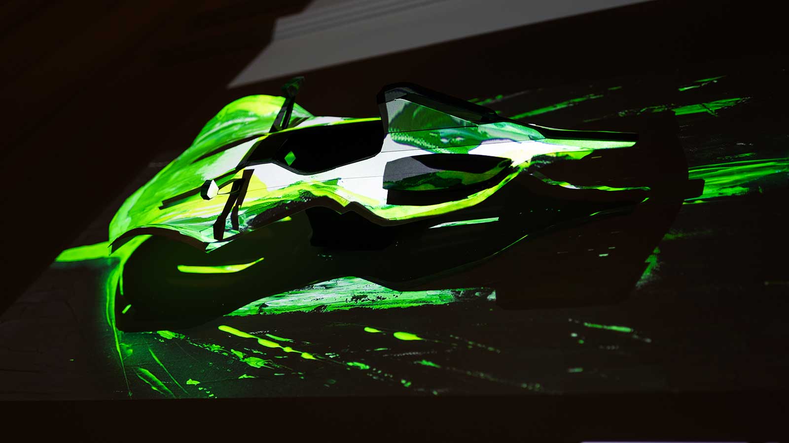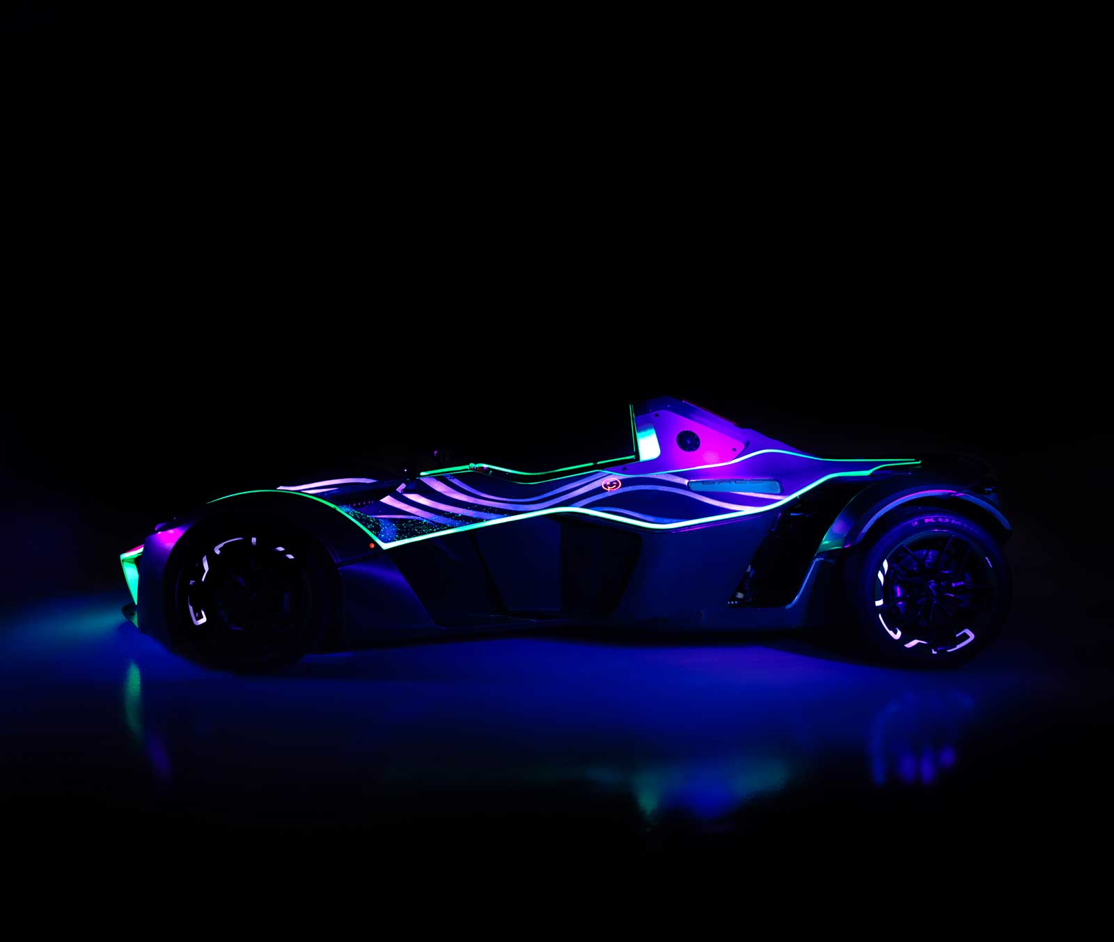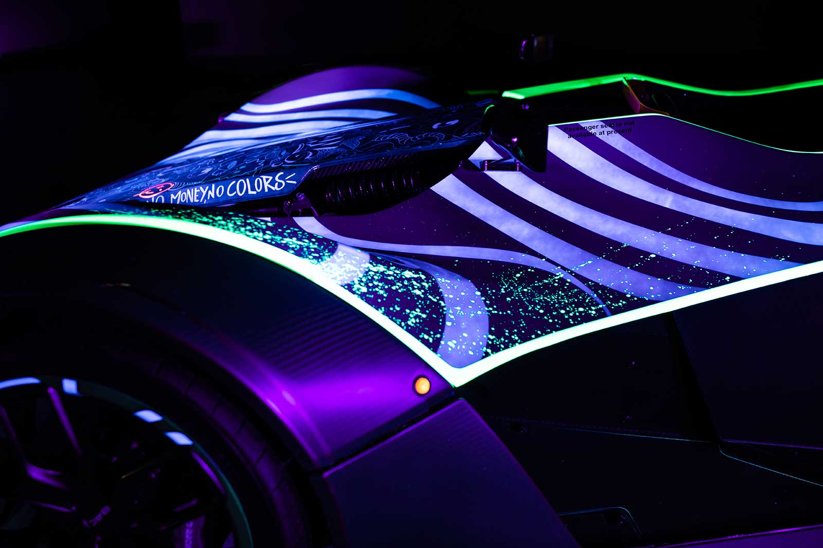The Art Car Mono has been designed with a special paint which, when subject to ultraviolet light, reveals the true depth of Turrek’s artwork. The Art Car Mono was revealed at the recent Sleeping With Art event held at Hedsor house, where it was housed in a blackout room and displayed continuously under UV light for art lovers to enjoy.