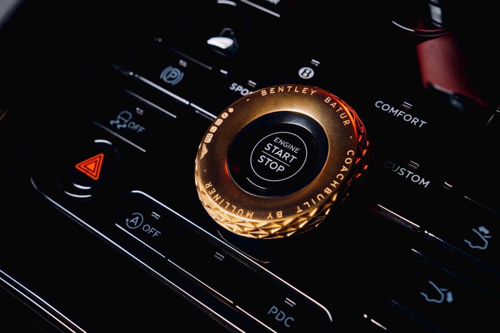 The veneers to the Instrument Panel, fascias and doors are Gloss Black painted, with a ‘guitar fade’ to Fine Brodgar that flows from the fascias to the doors, before fading back to black. The fascia is completed with a unique piece of art – a laser-etched sound wave, which represents the unique sound generated by the W12 engine. The metallic elements of the interior are a blend of Black Anodised Aluminium and Satin Titanium, completed with a hallmarked 18 karat gold Bentley Dynamic Drive Selector and ‘12 o'clock' steering wheel centre band.