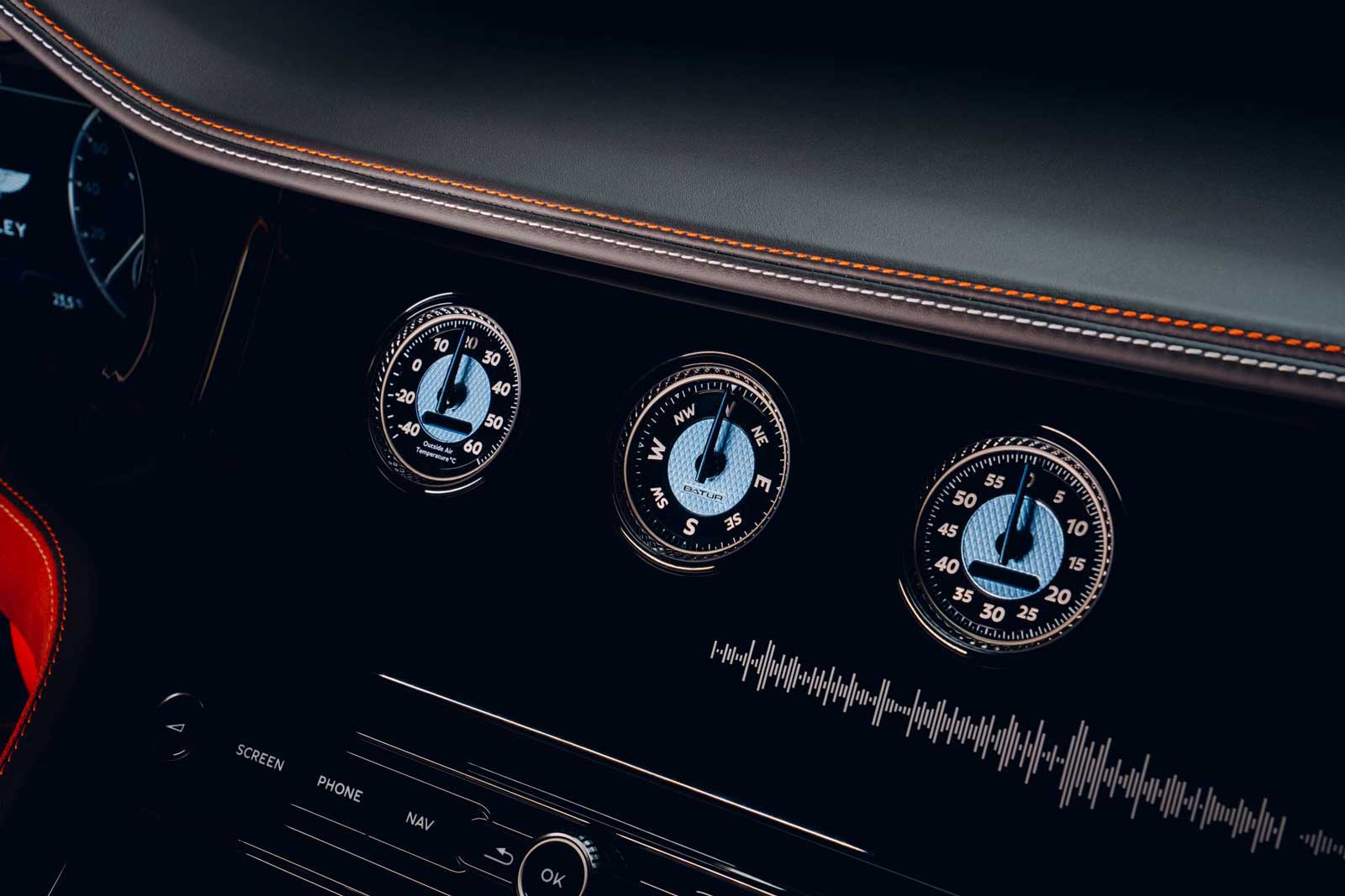 The interior of the launch Batur has been trimmed by hand in a stunning combination of black, red and orange – specifically, Beluga, Hotspur and Hyperactive. Beluga main hide is contrasted with new, even more sustainable low CO2 Mulliner Hyperactive Orange leather. A complementary texture is provided through the use of Dinamica – a suede-like alternative to leather – in both Beluga and Hotspur. Unique “Batur Chevrons” to the outer wings of the seats are finely embroidered by hand in Snap Orange thread, whilst the remainder of the upholstery carries a white thread in contrast throughout. The soft elements are completed with a new feathered artisan piping in Beluga, with Hyperactive Orange piping to the seat centres and a Hyperactive Orange finish to the lower spoke of the steering wheel.