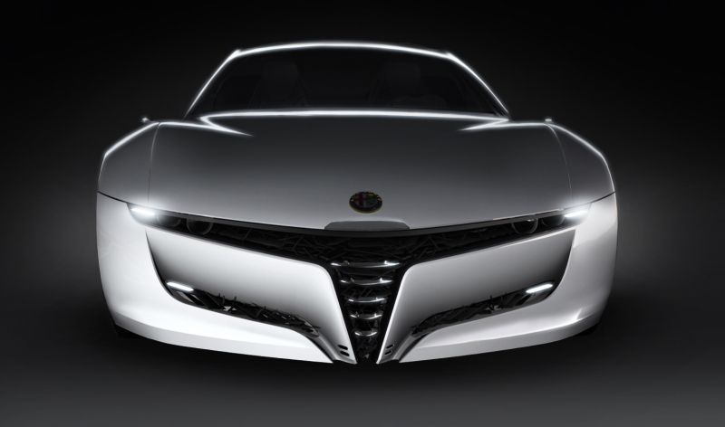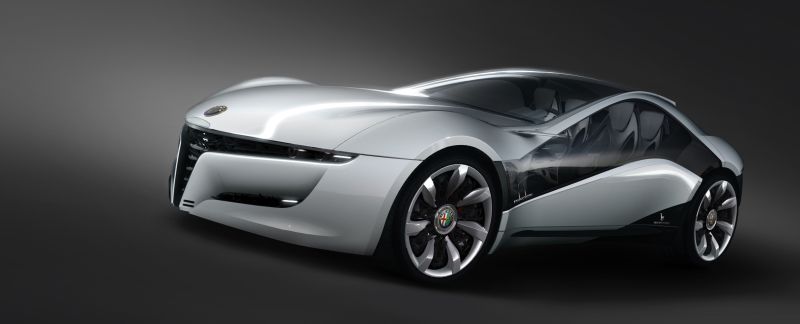 In keeping with the typical Italian Brand tradition, the Bertone Pandion was created to celebrate the 100th anniversary of Alfa Romeo and the historical partnership with Bertone. After a record 75 years of collaboration, Bertone has created over 23 Alfa Romeo models including both concept cars and production cars. The Pandion utilizes a powerful Alfa 8C engine (4.7-litre V-8; 450 HP at 7000 rpm; with a top speed of over 300 km/h) and features compact, muscly portions, typical of extreme sports cars, with a long pretentious hood and a cab-rearward greenhouse. The voluptuous white bodywork offers a high contrast to the generous dark glass surfaces which flow effortlessly across the streamlined bodyside. The quintessence of an uncompromised sports car is enhanmced by the spectacular door opening mechanism which lifts the entire bodyside by rotating it reversely around the rear hubs, generating two giant, 3.6 meter, perfectly vertical wings.