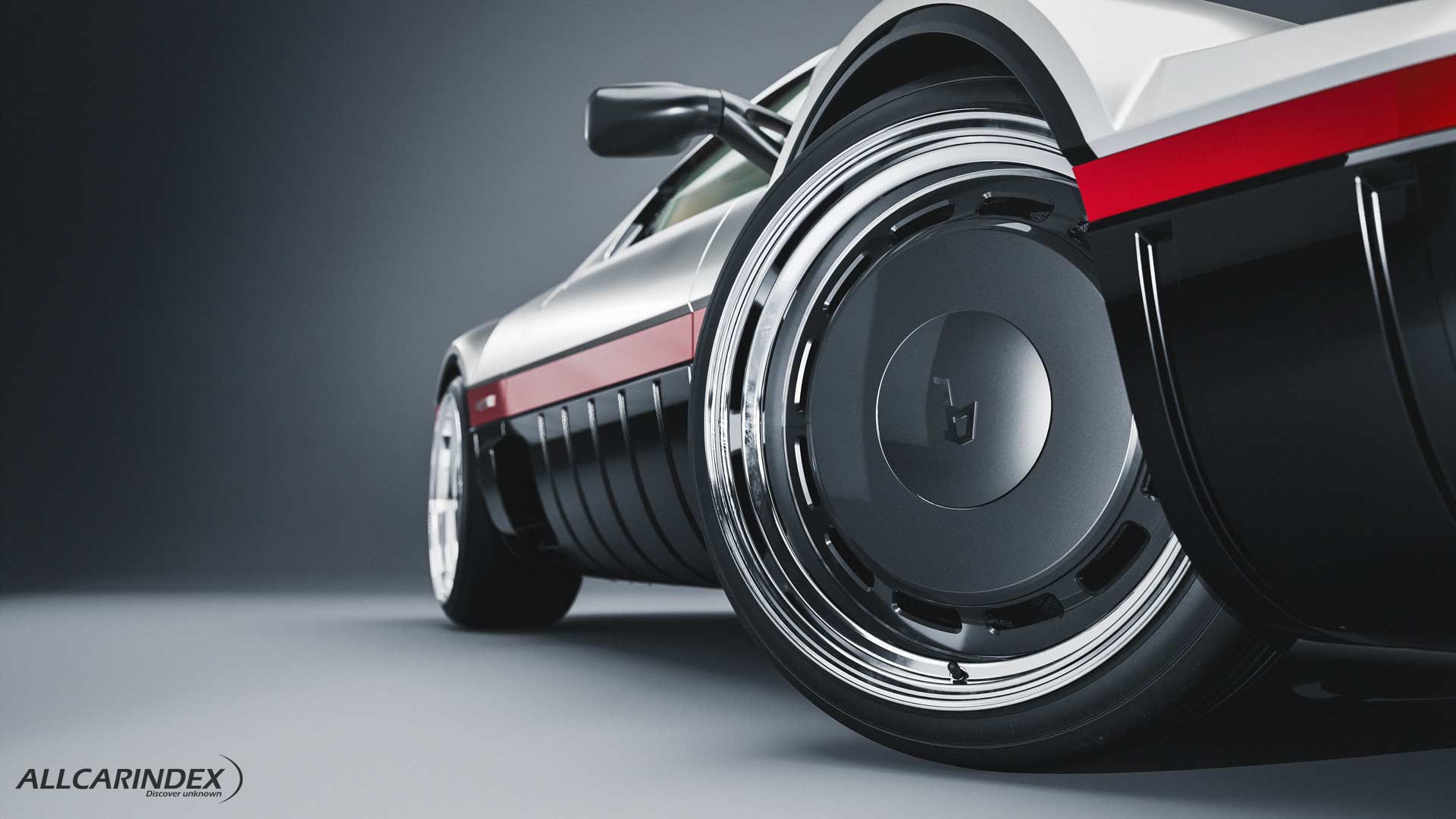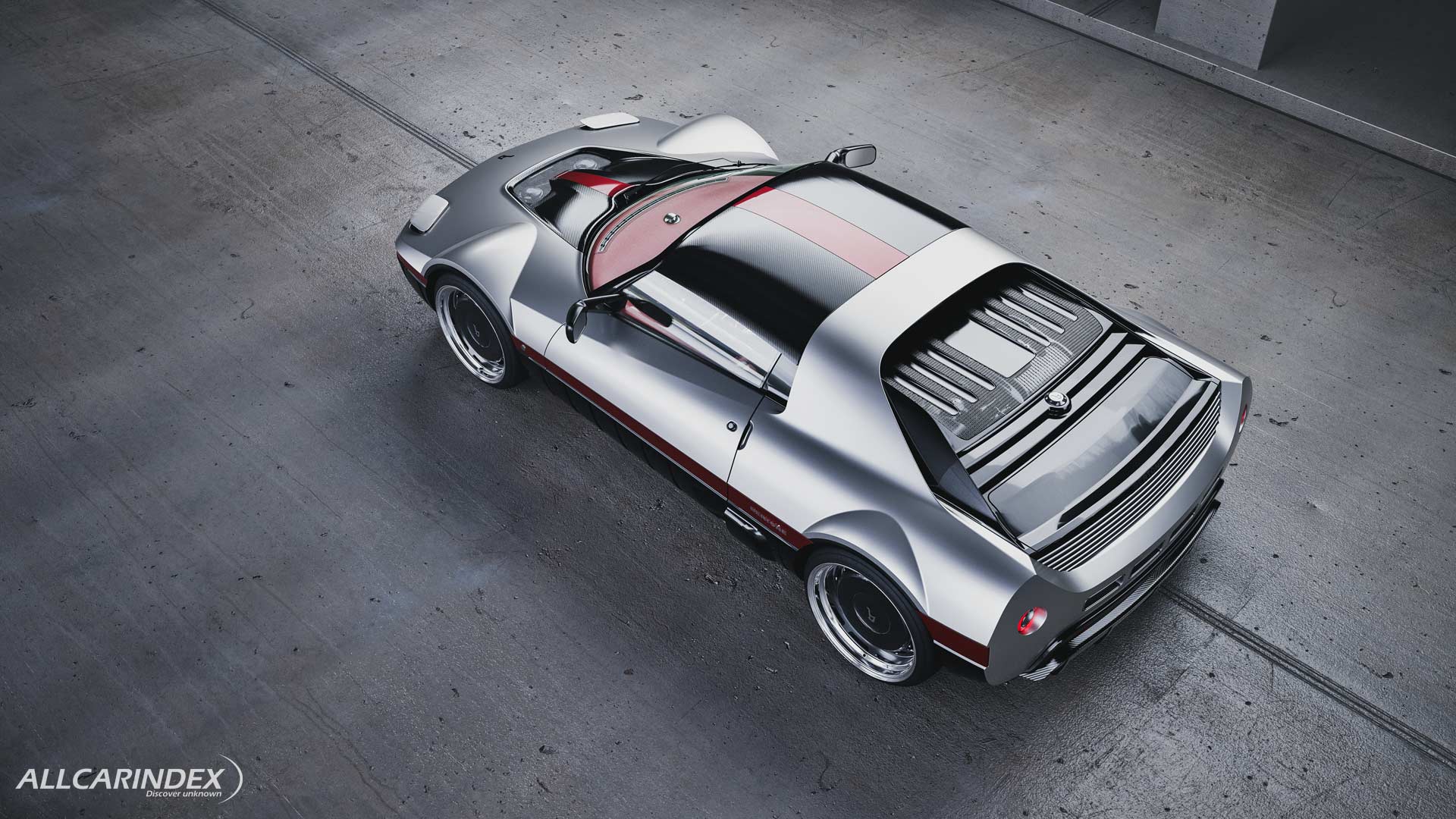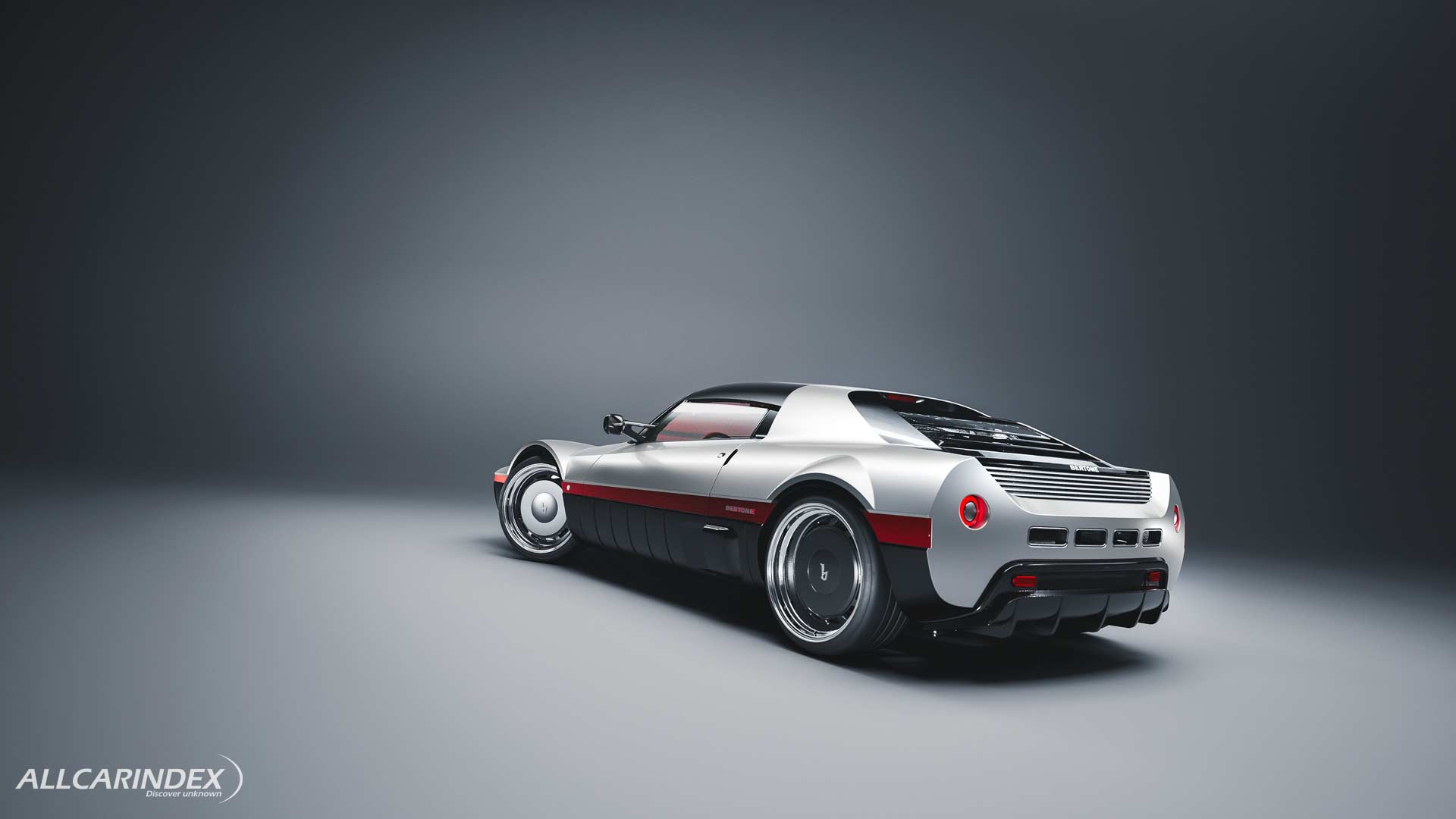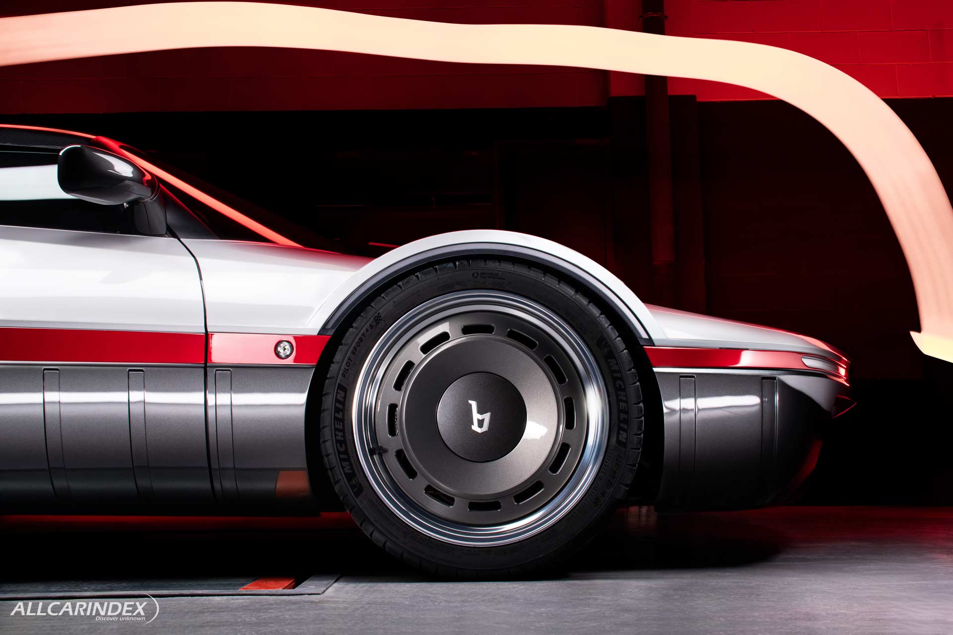 The rear section presents a modern interpretation of the coda tronca, reduced to essential geometry. Four rectangular apertures define the rear graphic, with exhaust outlets integrated into two of these openings. Forged aluminum wheels draw direct inspiration from the original 1969 concept.