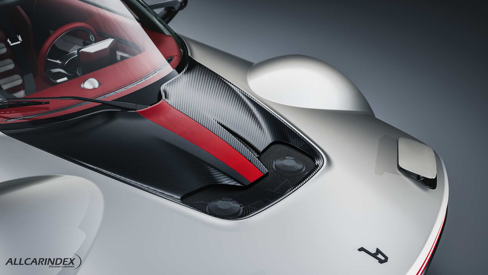 The bodywork features extensive carbon fiber construction integrated with a lightweight bonded aluminum chassis built from extruded aluminum architecture. At the front, an integrated S-duct manages airflow for cooling efficiency and aerodynamic balance. Reinterpreted pop-up headlights reference classic design elements within contemporary surfacing, while a continuous horizontal element connects the sculpted fenders.