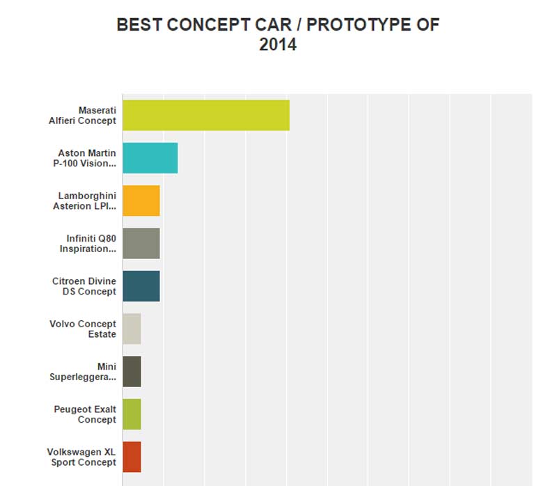 In the category BEST CONCEPT CAR / PROTOTYPE OF 2014 the winner is - MASERATI ALFIERI CONCEPT (41% percent of responses).