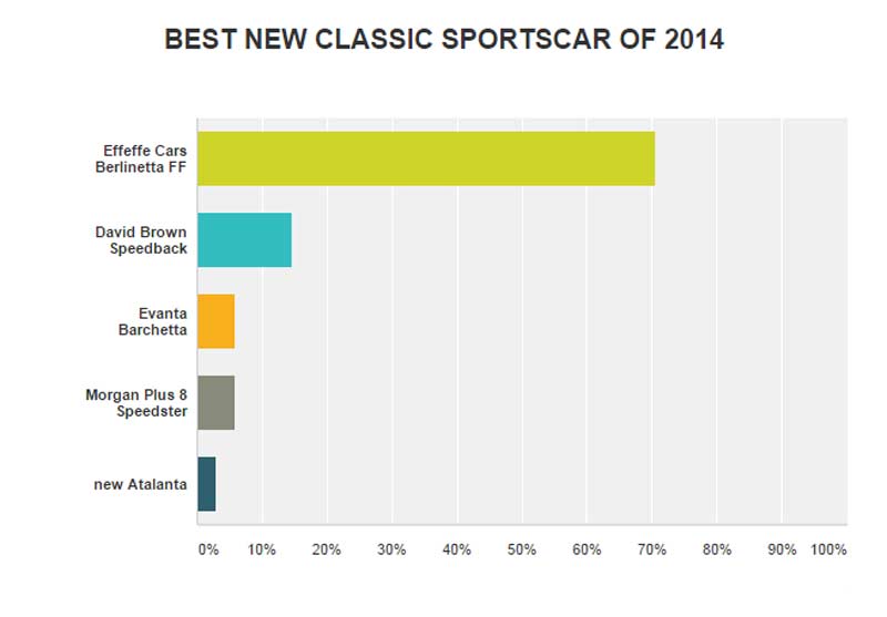 In the category BEST NEW CLASSIC SPORTSCAR OF 2014 the winner is EFFEFFE BERLINETTA SS (70.5% percent of responses).