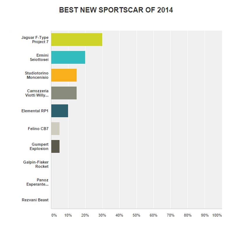 BEST NEW SPORTSCAR OF 2014 by AllCarIndex.com visitors is the JAGUAR F-TYPE PROJECT 7 (30% of responses).