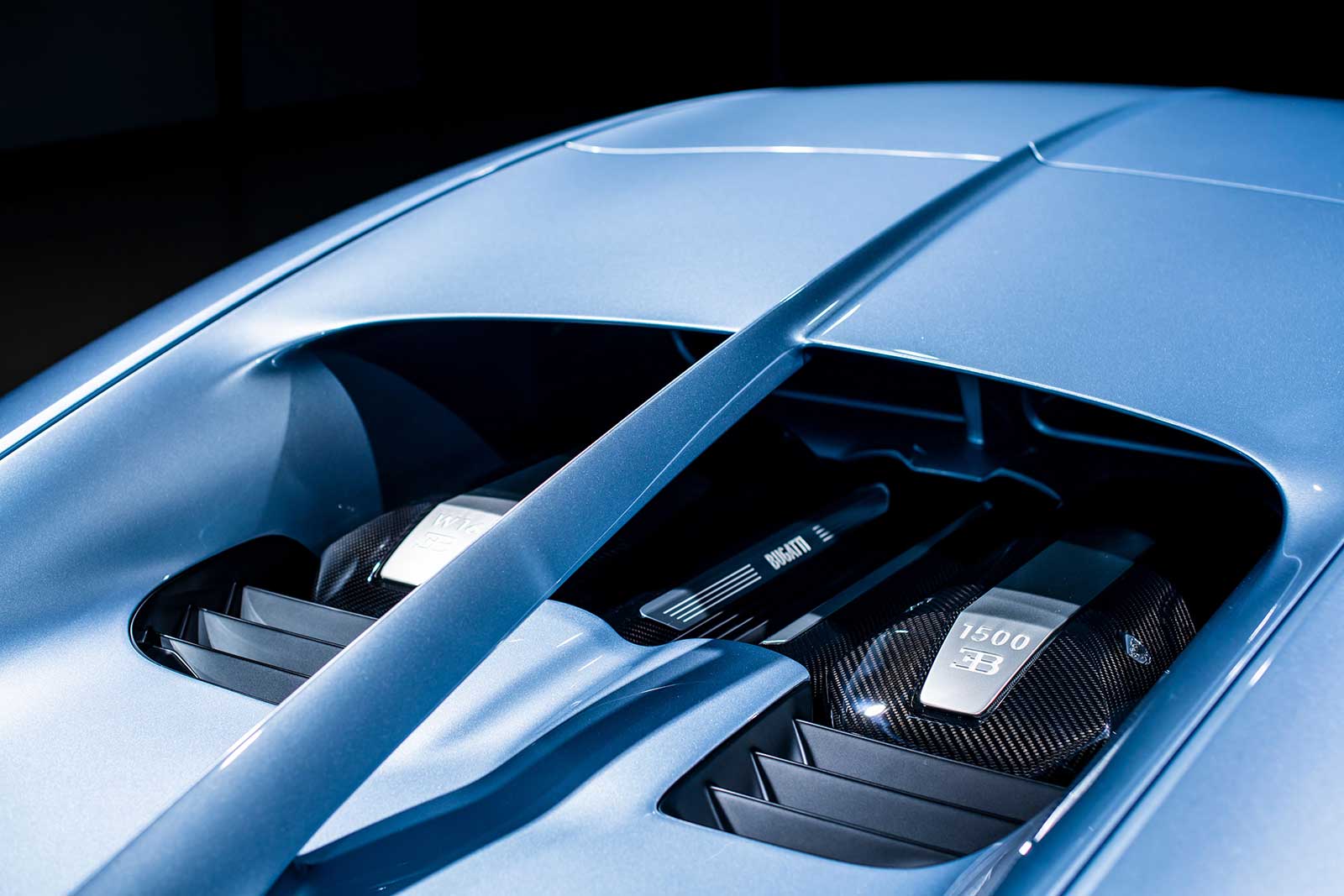 In character, the Profilée maintains much of the purity of the Pur Sport; designed for lateral grip and ultimate acceleration. It is powered by the same 1,500 PS development of the Bugatti W16 engine, with 15 per cent shorter transmission ratios than the Chiron Sport. The Profilée accelerates from 0 to 100 km/h in 2.3 seconds and up to 200 km/h in 5.5 seconds. It has a top speed of 380 km/h compared with the Chiron Pur Sport's 350 km/h.