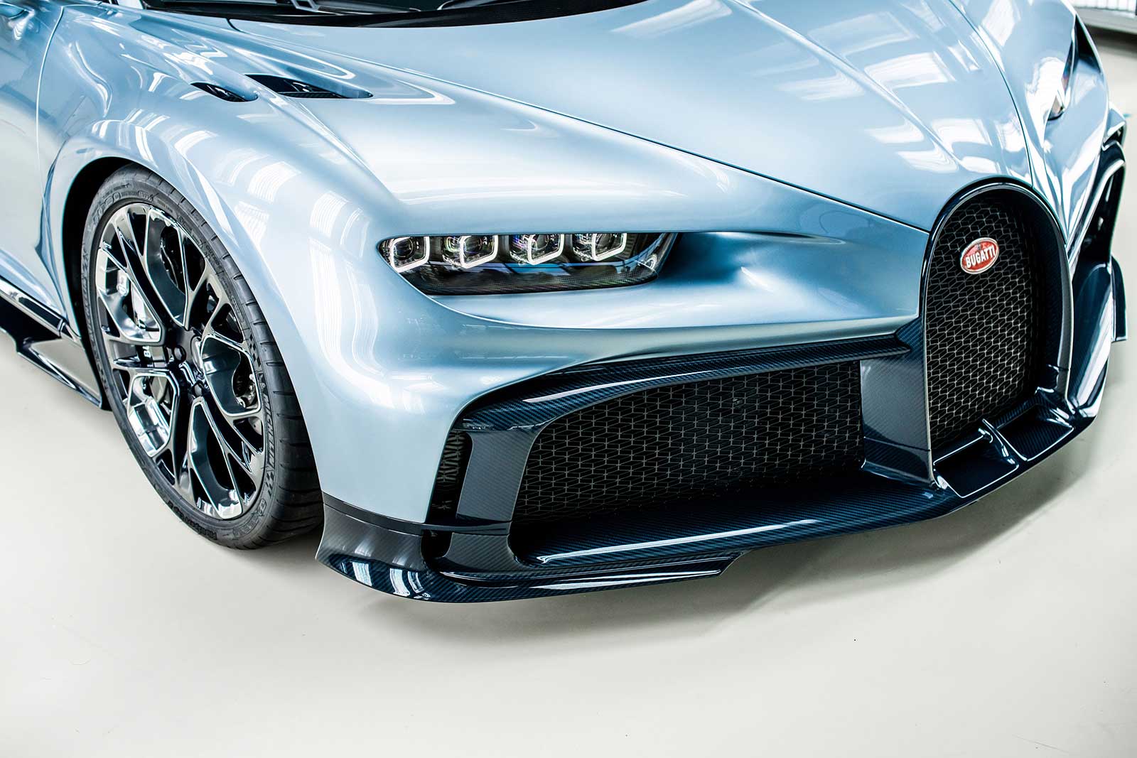 The Profilée is presented in a primary color of Argent Atlantique, exclusively developed for this car. No other Chiron model has been configured in this shade. The lower part of the car is finished in exposed carbon fiber, tinted in the existing Bugatti color of Bleu Royal Carbon. The wheels are – again – unique, especially designed, manufactured and tested for the Profilée, and finished in a shade of Le Patron, created to match the carbon tint of the lower half of the body. Polished aluminum elements reflect the famous shape of the Bugatti horseshoe grille.
