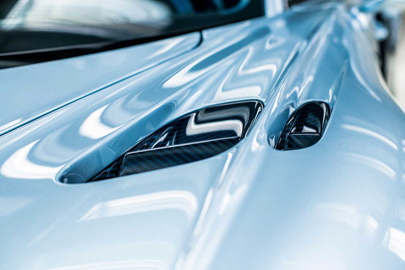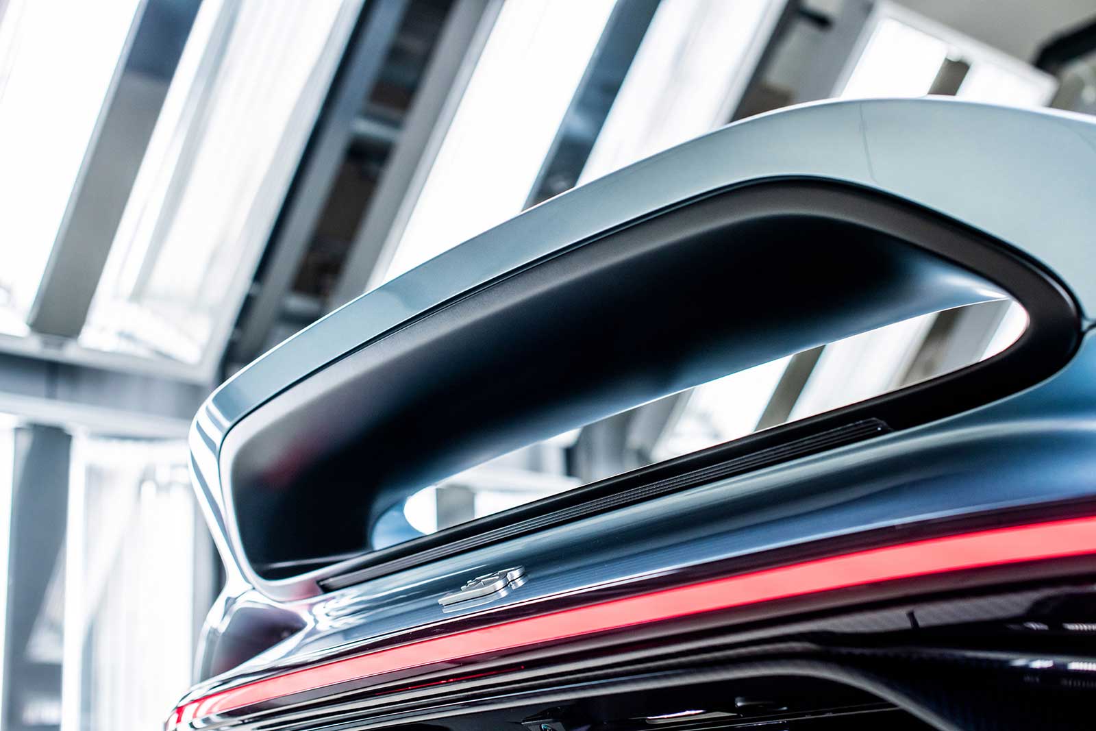 The Profilée is a bespoke design featuring a sweeping fixed tail at the rear, which carries out two crucial functions. Firstly, the wing ensures stability and control right up to the Profilée's 380 km/h top speed by increasing downforce over the rear axle, and secondly, it uses negative pressure to suck hot air out of the engine compartment via two interior tunnels in the high-temperature carbon wing. Air flows both over the top of the wing to generate downforce, but also under the wing to draw air from the engine compartment.