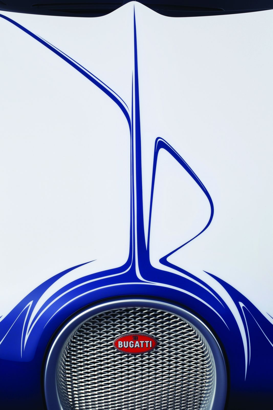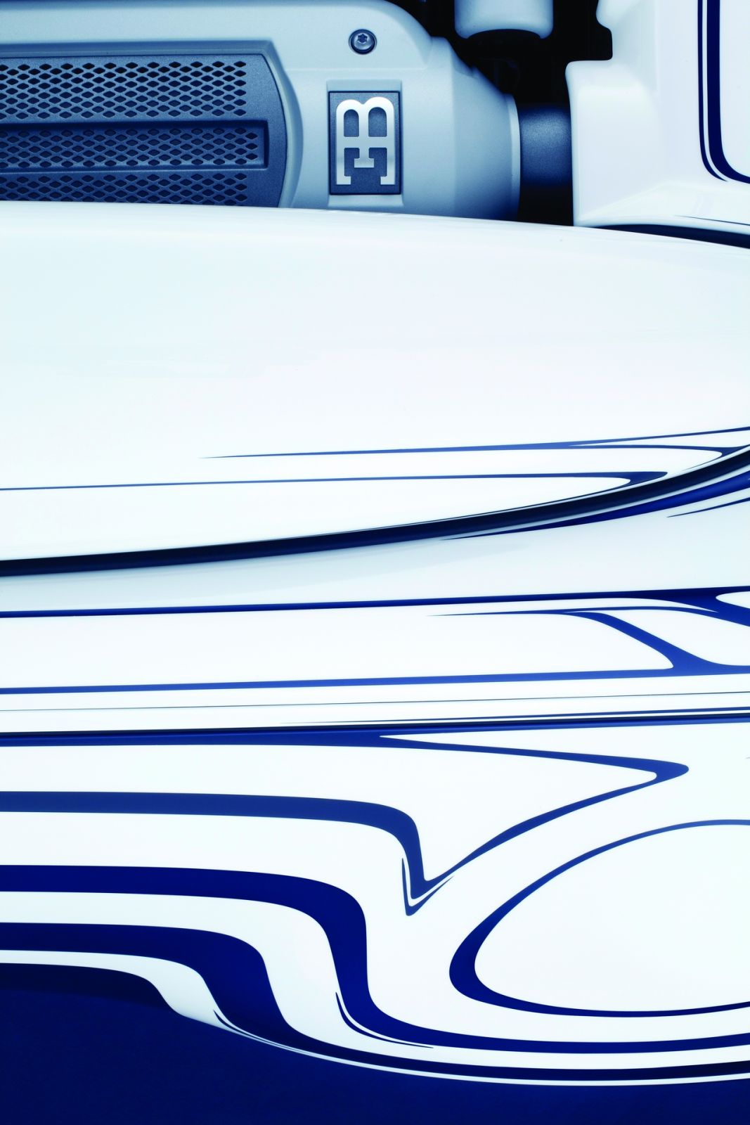 in the next step, bugatti’s paint specialists dedicate themselves to the further completion of the masterpiece. over the course of three weeks, each millimeter of the marked lines are being filled by hand with the characteristic blue color. in addition, the whole body receives five layers of clear lacquer. a varying and powerful gradient of the two colors is generated because the team had used a combination of tapes with different widths. while the blue lines dominate over the white spaces in the lower section of the convertible, the relation of colors inverts on the way to the roof so that the intense white appears even stronger. twelve elements, made of finest porcelain at the berlin based manufactory, complete the aesthetic approach of this special grand sport.