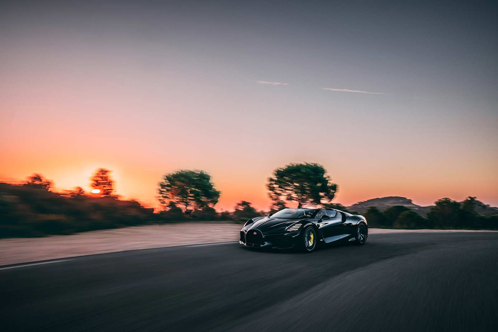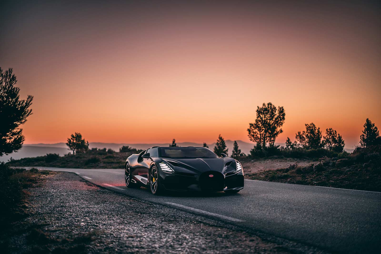 The W16 Mistral¹ glides over beautiful twisting roads in the foothills above the Côte d’Azur, with the evocative soundtrack of its W16 powertrain reverberating off the scenery. From all around – below and above, head on and sideways – is a unique southern France airstream, matching the W16 Mistral’s characteristics in perfect harmony.