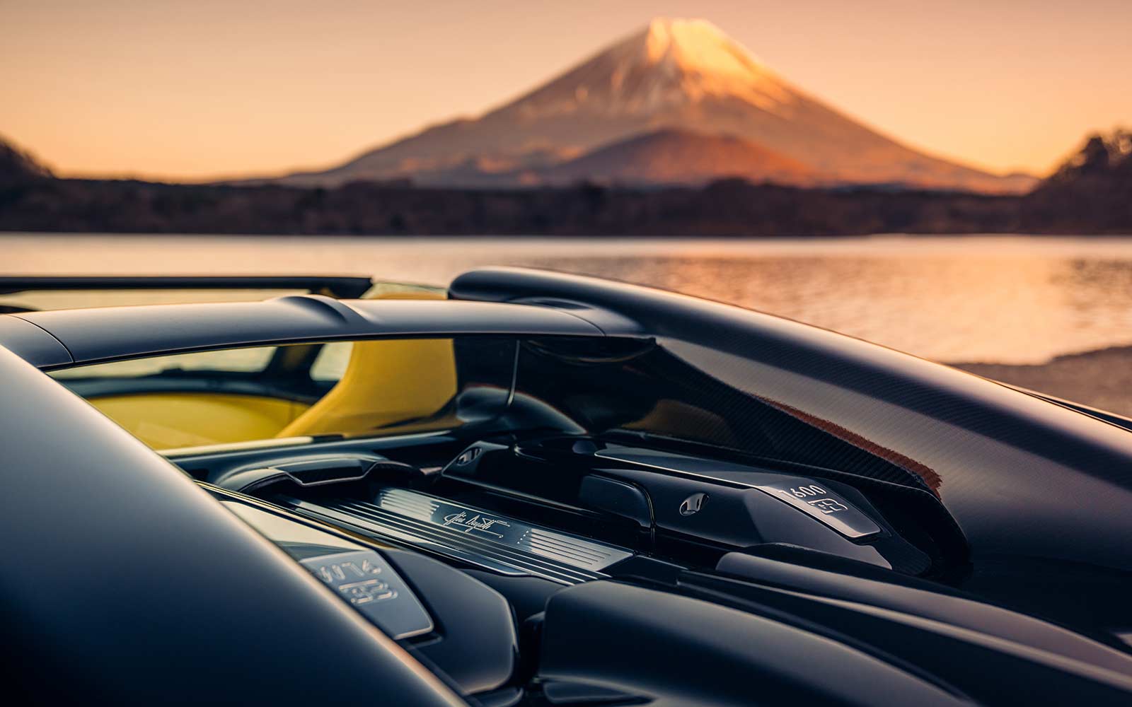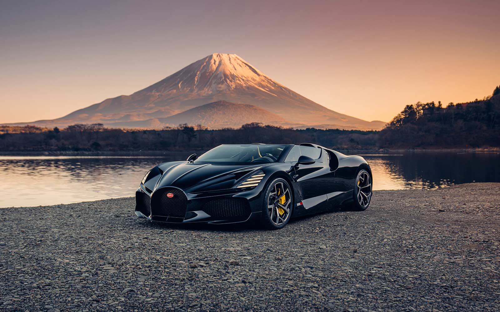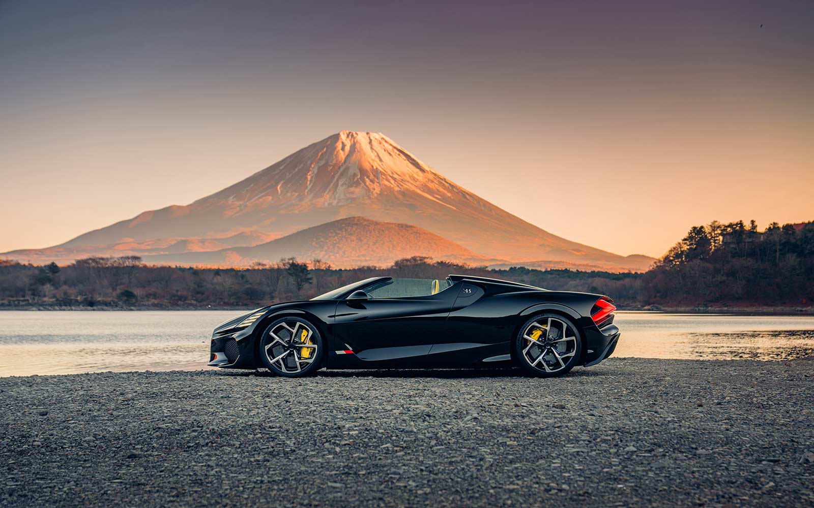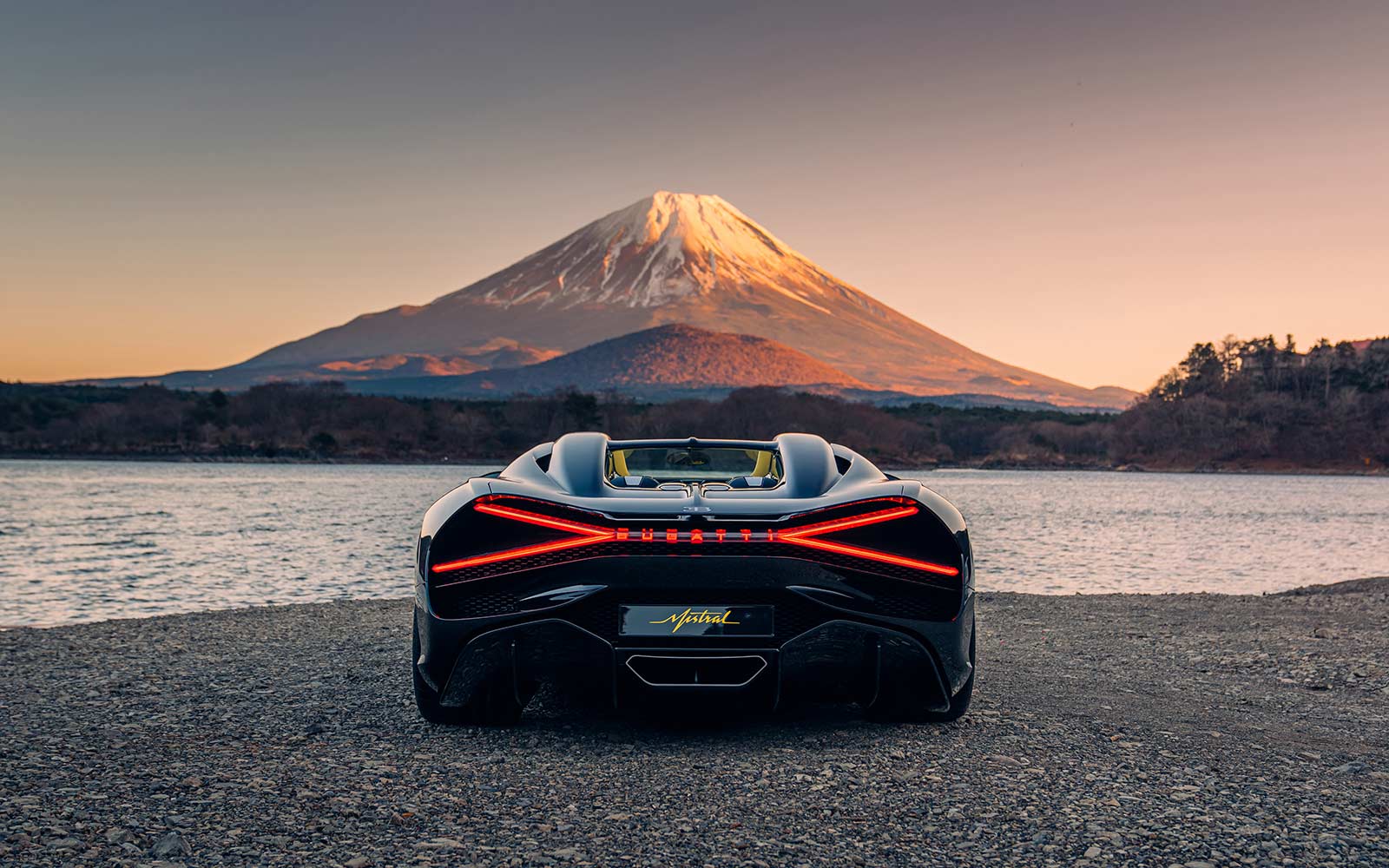 The W16 Mistral also passed by the Oishi Park, with Mount Fuji in the distance and Lake Kawaguchi in front. Here, in the fading light, the striking rear treatment, highlighted by the X-themed taillight motif, is a shining beacon for the future of Bugatti design.