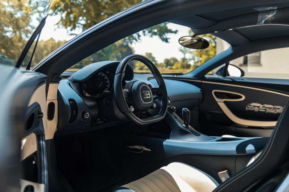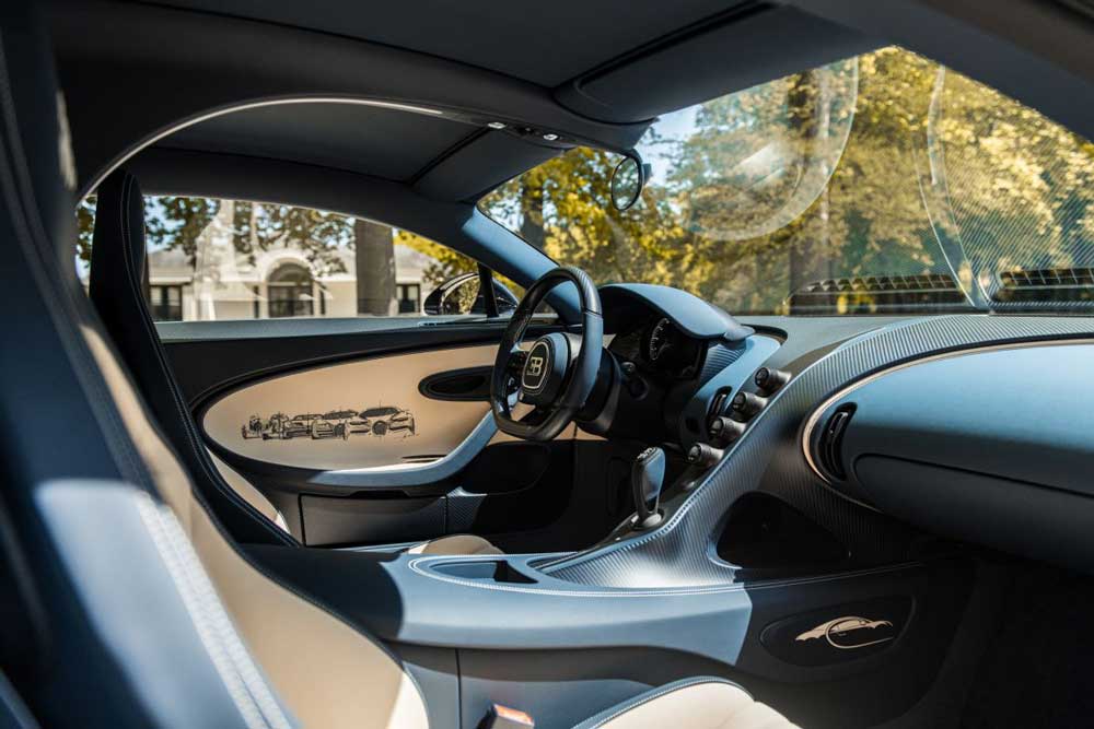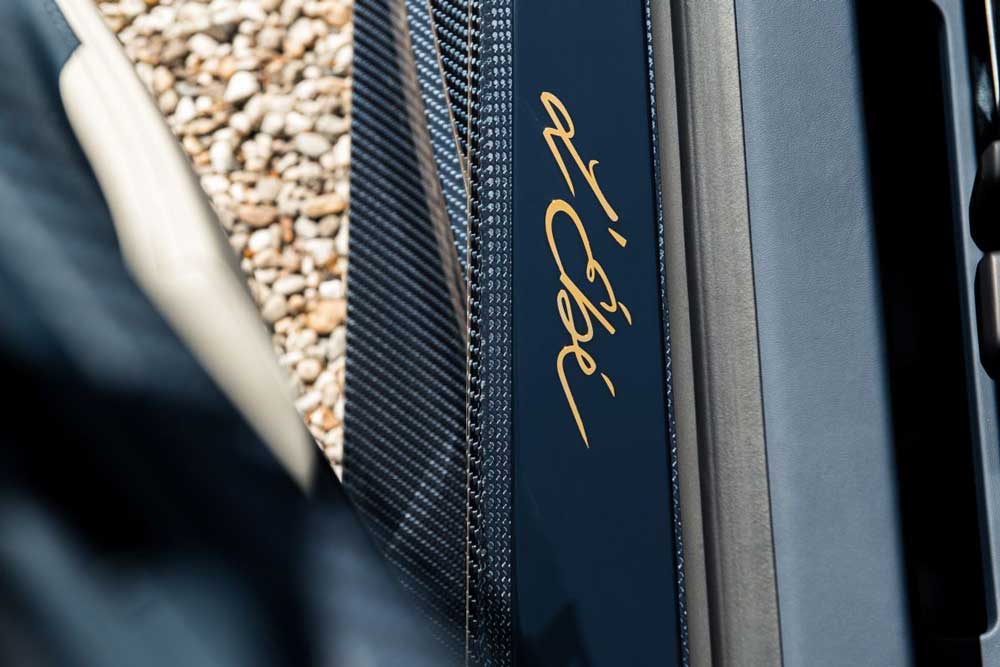 L’Ébé’s signature logo hides subtly on the underside of the retractable rear spoiler, as well as on the treadplates and hand-stitched into the headrests of the seats. The cabin subtly mirrors the exterior, with exposed blue-tinted carbon visible throughout and a light versus dark theme, hinting at L’Ébé’s dark blue body and gold highlights. The door panel on the driver’s side is finished predominantly in “Silk” leather with “Lake Blue” highlights. The passenger’s, meanwhile, reverses the colour scheme. Each door panel features a motif of the visual evolution of Bugatti’s most iconic cars, from early Grand Prix racers through to EB110, Veyron and Chiron. L’Ébé’s numerous bespoke touches perfectly showcase Bugatti’s limitless creativity and craftsmanship when it comes to exclusive tailor-made projects.