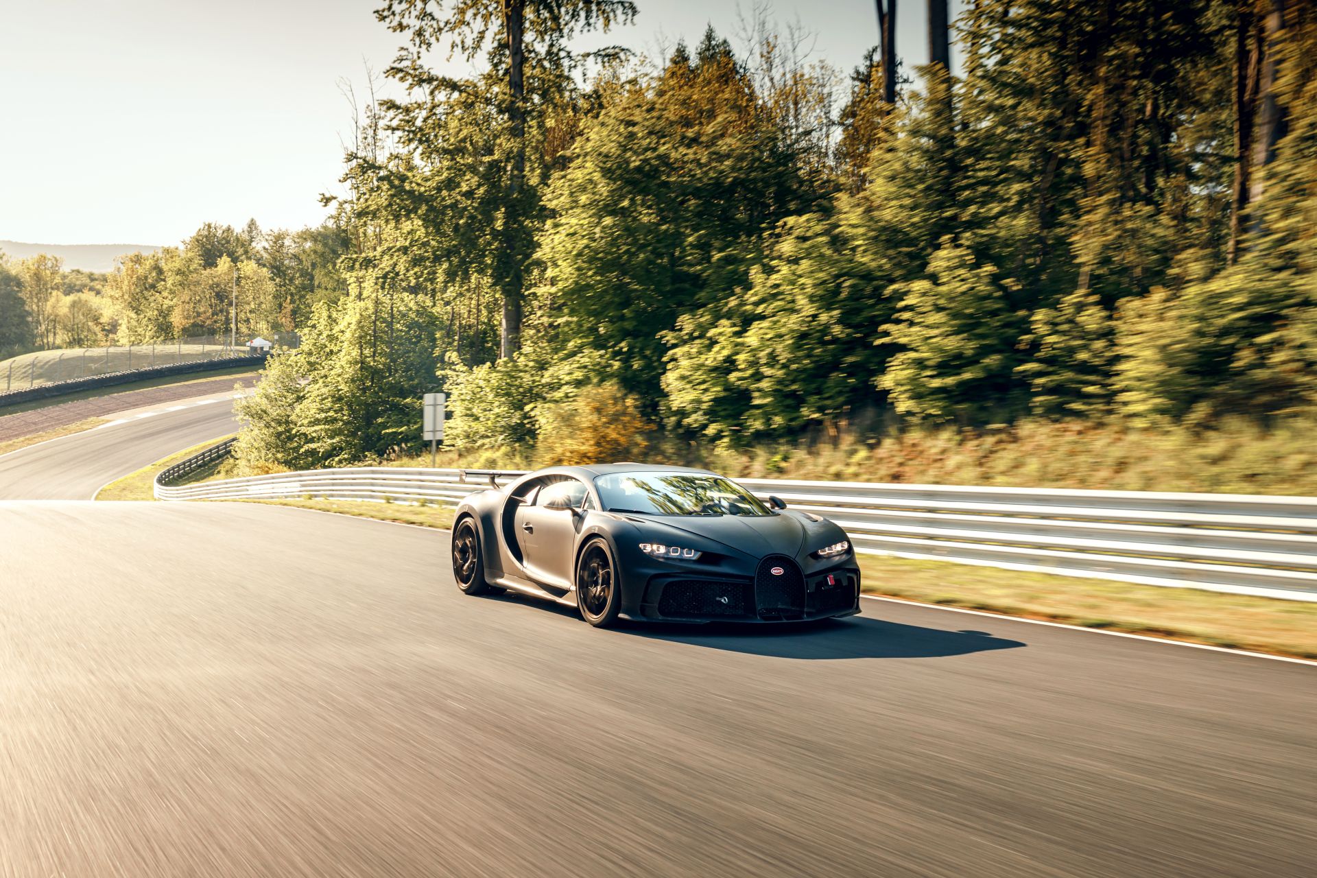 A deep bubbling roar emerges from the bend, followed by a loud hissing sound. A black Bugatti turns into the start-finish straight, shoots past the pits at full throttle shortly afterwards – and disappears into the next bend. Fast, powerful and spectacular.