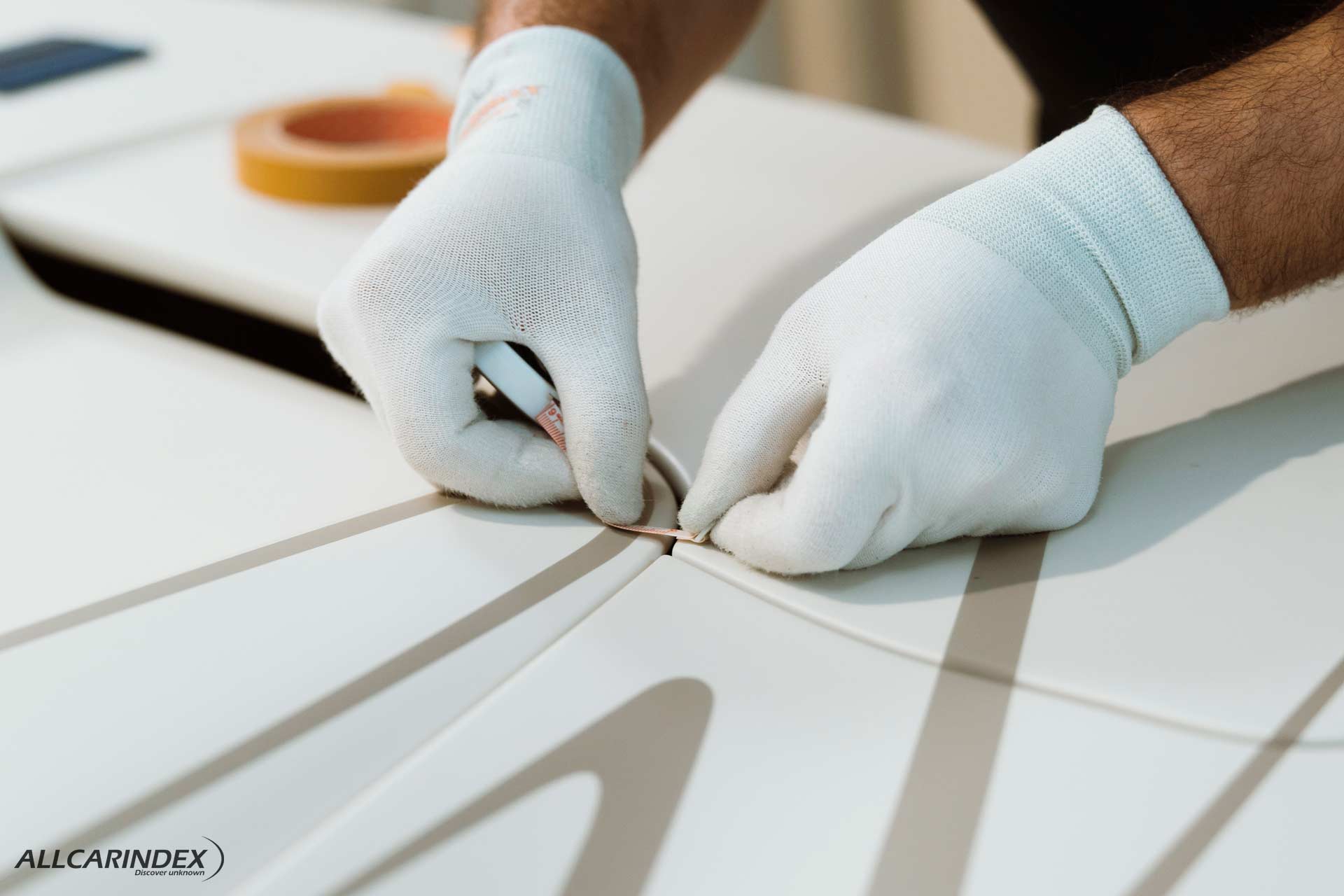 Developing the final color palette required extensive exploration. While the project began with a silver concept, the direction eventually shifted toward varying white tones enriched with bright metallic flakes. This evolution led to the creation of two entirely new bespoke colors: a warm, gold-infused hue for the upper surfaces and a refined warm white for the lower body. The signature white and gold dividing lines that define the car's identity were achieved through hundreds of hours of hand-applied taping, masking, and painting. This meticulous process extended to the diamond-cut alloy wheels, which feature a specially curated paint mixture to mirror the bodywork.