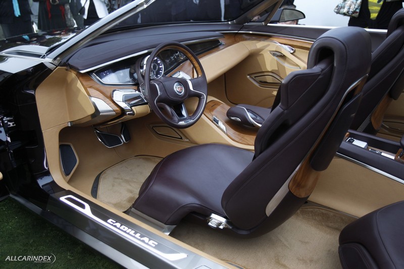 a prominent, polished aluminum windshield frame serves as in important structural element of the vehicle, as well as aesthetic one, recalling classic open cars of the past. additional exterior cues, including a shield grille and vertical lighting elements, are pure cadillac, but suggest a more organic interpretation of the brand’s signature design language that emphasizes the artistic and natural sides of it. the body sides, for example, are more rounded, sweeping upward. bright work is used to bring contrast to the deep paint color, but plays a more supporting role.