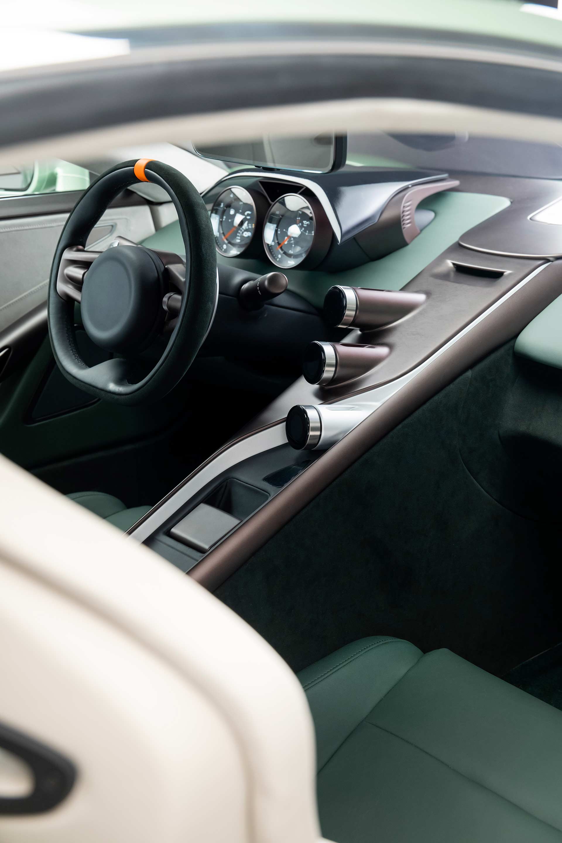 Inside, CALLUM has redefined the stunt car’s utilitarian cockpit with a sophisticated, driver-centered design. CALLUM’s head of design, Aleck Jones, highlighted the unique approach: rather than choosing between dark sporty or light luxurious interiors, the team combined both. Rich green and cream shades meet along a dynamic 40-degree “waterline,” creating a striking yet harmonious interior. Premium Bridge of Weir leather upholstery ensures comfort, while a modernized cockpit showcases CALLUM’s hallmark “Arrowhead Necklace” metal feature encircling the cabin.