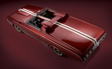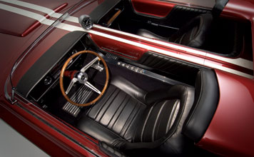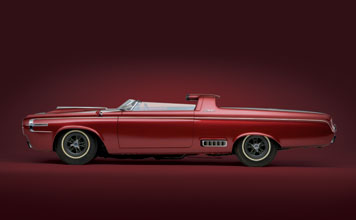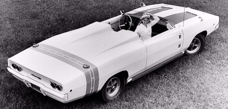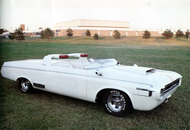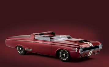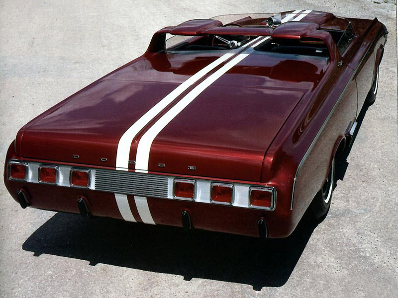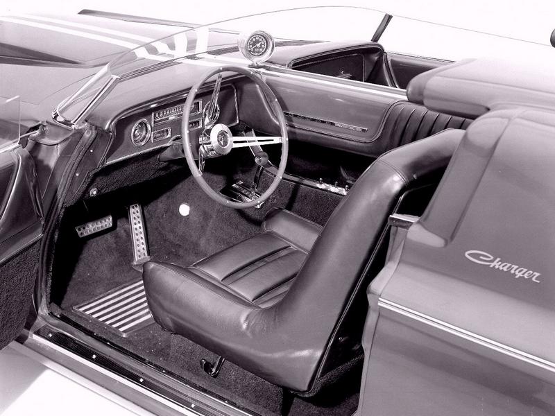 In 1964, Dodge introduced the Charger specialty show car, which was based on the 1964 Dodge Polara convertible. The Charger featured a range of custom elements, including a cut down windshield, roll bar with built-in headrests, hood scoops, side rectangular exhaust ports, and a 365 horsepower, 426 cubic inch V-8 engine. The custom Charger rolled on Halibrand magnesium wheels wrapped in Goodyear Wingfoot high-performance tires. Inside the charcoal-gray leather 2-seat cockpit, the Charger featured a deep-dish walnut wood steering wheel, wood gear shift selector handle, and passenger grab handle. Atop a unique divider between the seats sat an 8,000-rpm tachometer.