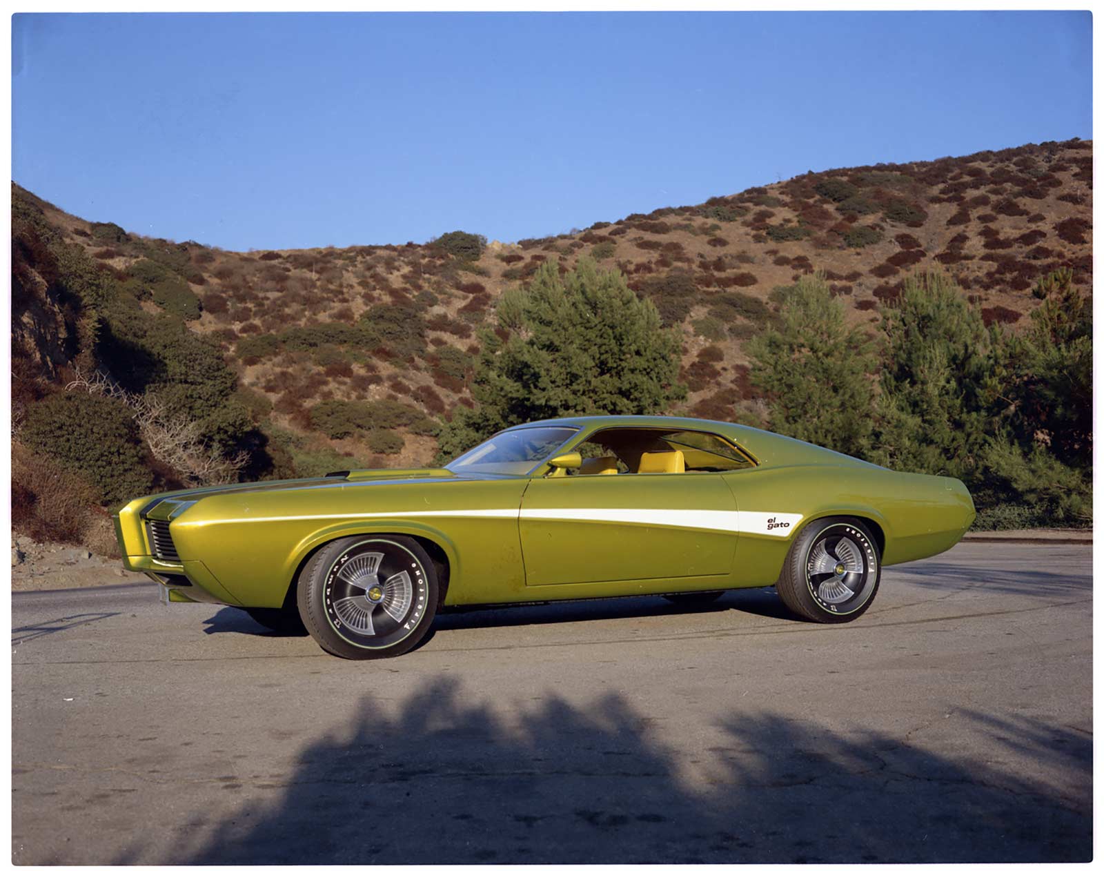 The El Gato was an experimental modification of the 1970 Cougar. Both the windshield and the sloping back window were at rakish angles to enhance the low, sleek look of the car, with this being the first appearance of a fastback roof on a Cougar. The unique green body finish was lighter in hue above the sculptured character line, with a tapered paint stripe calling attention to the color break.