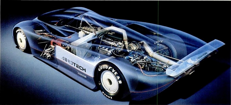 The engine and performance specs of the Oldsmobile Aerotech were impressive - with a mid-engined position, Oldsmobile Quad 4 engine with single or twin-turbo, 1993cc capacity, and a power output of approximately 850-1000 hp. The top speed of the Aerotech reached 455 km/h. The dimensions of the vehicle were also noteworthy, with a length of 4880 mm, width of 2180 mm, height of 1020 mm, wheelbase of 2830 mm, and a weight of 726 kg.