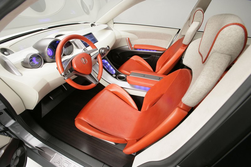 Inside, the RD-X boasted an ultra-modern driver-oriented cockpit with a sizeable, easily transformable cargo area. The interior featured a combination of ivory leather and suede trim, tangerine-colored crocodile-embossed leather, and off-white suede. The cockpit included an eight-inch color LCD screen, the Acura Navigation System with Voice Recognition, a clear acrylic wing, and metallic gauges.