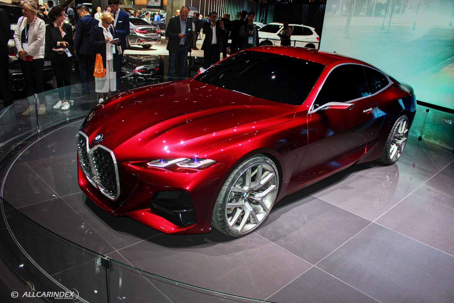 Moving to the side of the car, the BMW Concept 4 displayed BMW’s signature proportions in a modern and elegant design. The powerful main body with tautly chiselled volumes and precise contours created a rare sense of emotion and dynamism. The Forbidden Red exterior paint accentuated the car’s surfaces, projecting a rich, glossy red in the light and almost black in the shade.