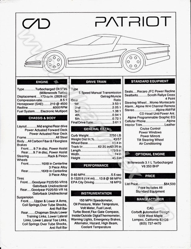 in 1989, adrian corbett sold cmc to a company in florida. having made just 26 countach units (6 turnkeys and approximately 20 kits) he established a brand new company – corbett automotive design – a.k.a. cad. new company was now operating from lampoc, california (just 55 miles from santa barbara) – practically the same place that corbett started to realize his automotive dream. in this destination, it was just the right time for the next model to appear. the answer to kit car’s question was the patriot.