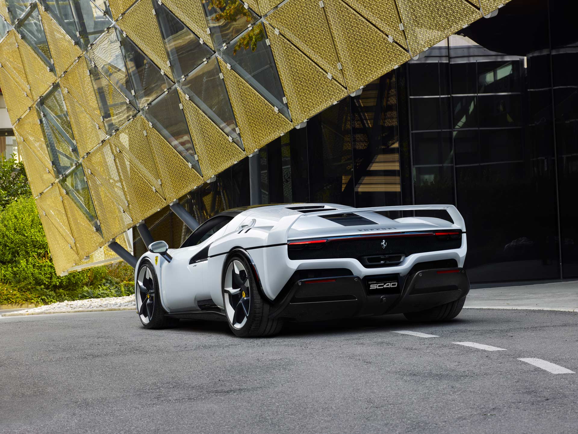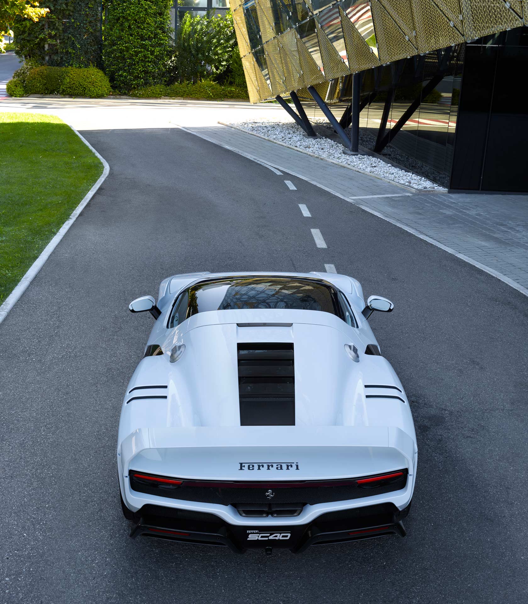 The SC40 White exterior colour highlighted the car’s sculptural volumes under natural light, subtly recalling the tone of the carbon-Kevlar used inside. The SC40 logo appeared only on the right-hand side, while the fuel and charging caps were machined from brushed aluminium. The Ferrari script on the rear engine cover was laser-etched in negative, exposing the carbon fibre beneath. The bespoke wheels combined brushed metal and black spokes, reinforcing the geometric character of the design.