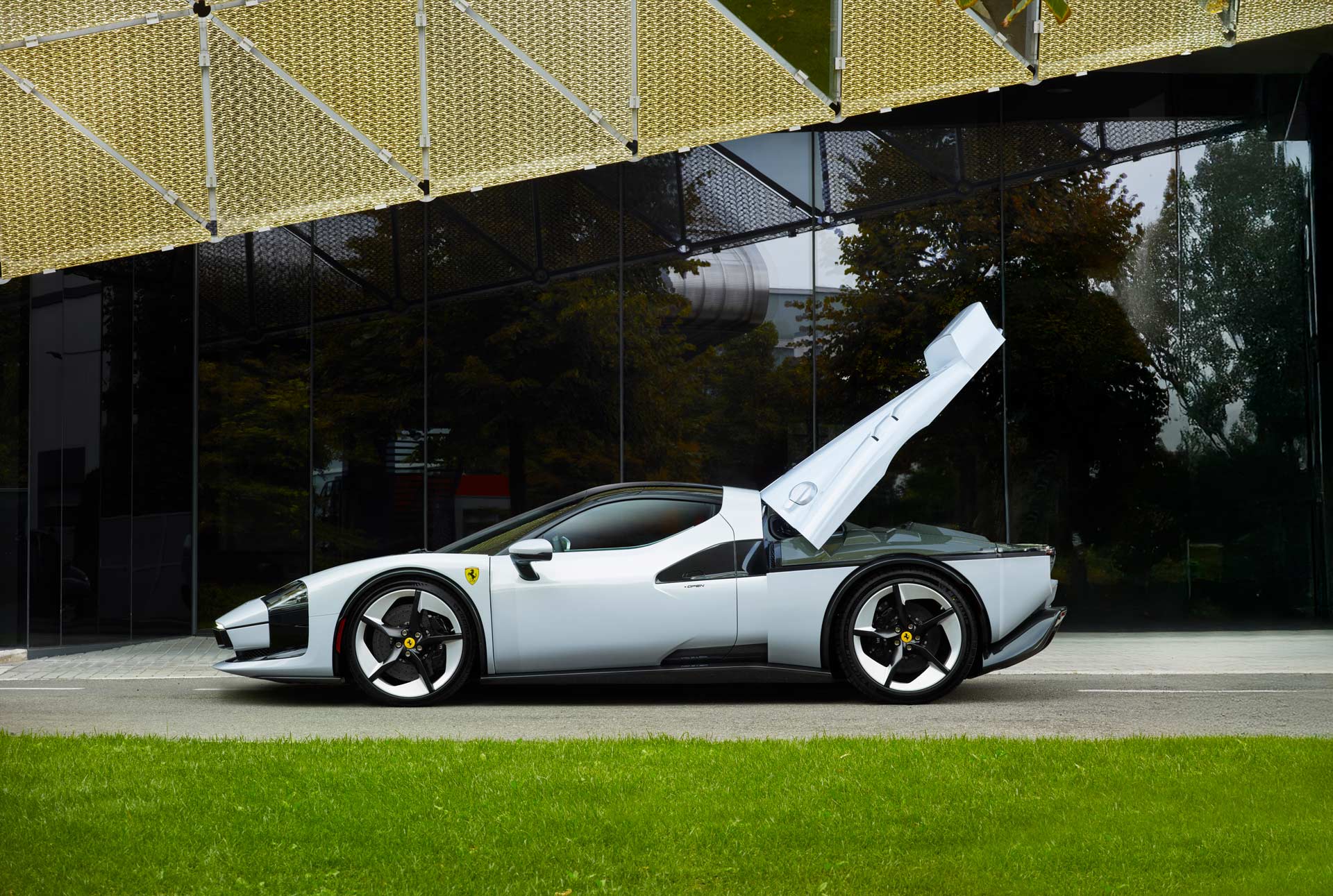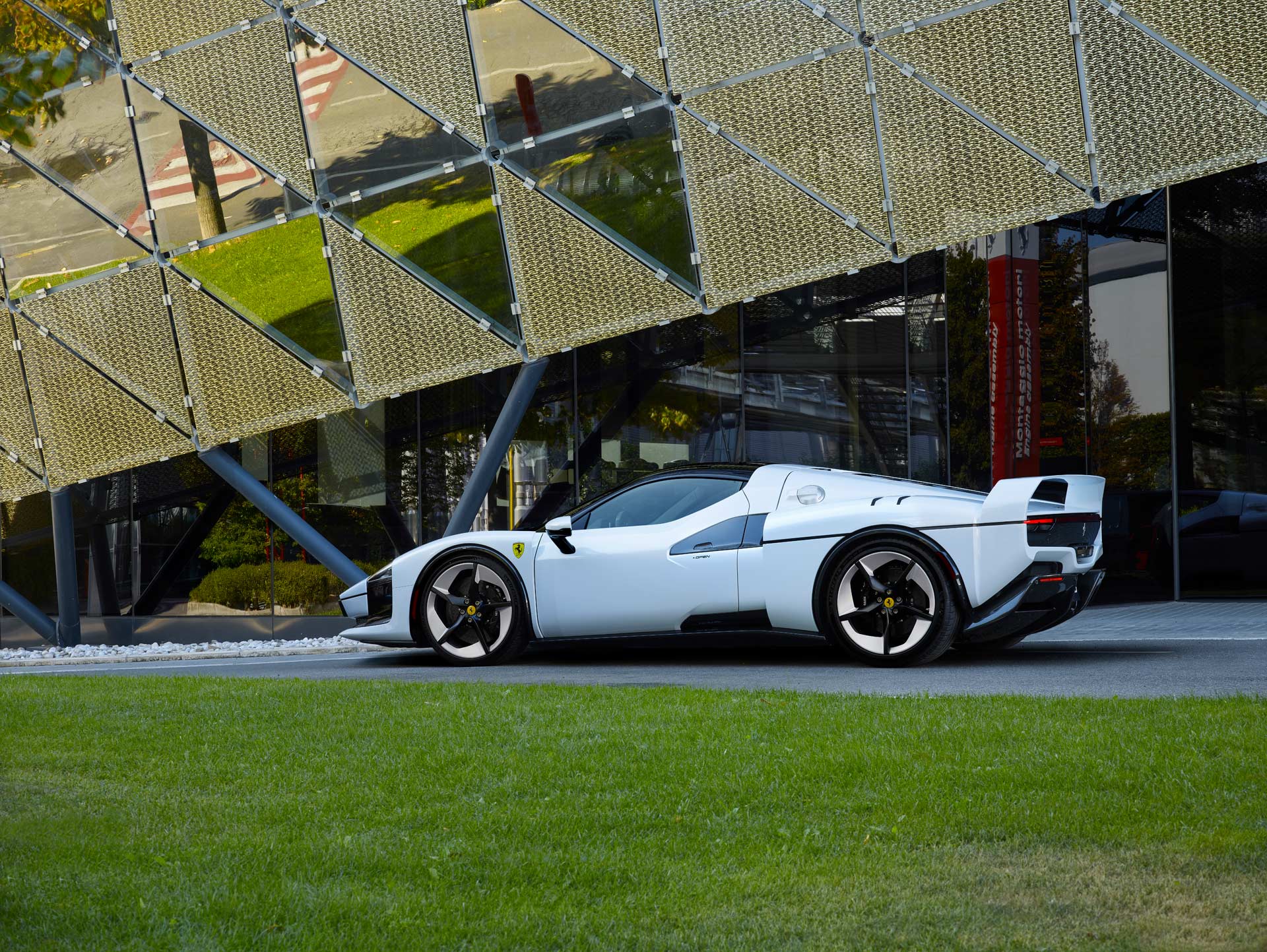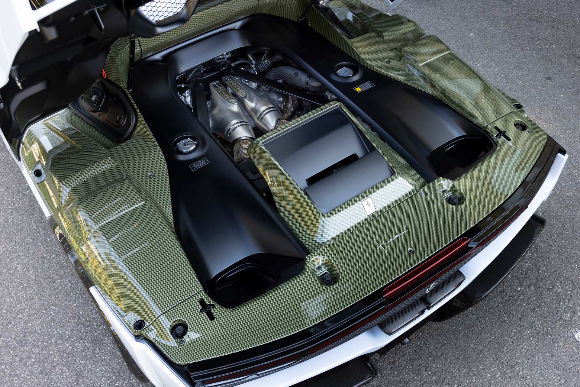 Distinctive smoked Lexan® louvres showcased the V6 engine and connected visually to the lower air intakes. Additional louvres on the rear wings reinforced the design’s muscularity. The central exhaust, produced using additive manufacturing, featured titanium and carbon-fibre tips, while taillights subtly referenced the 296 GTB.