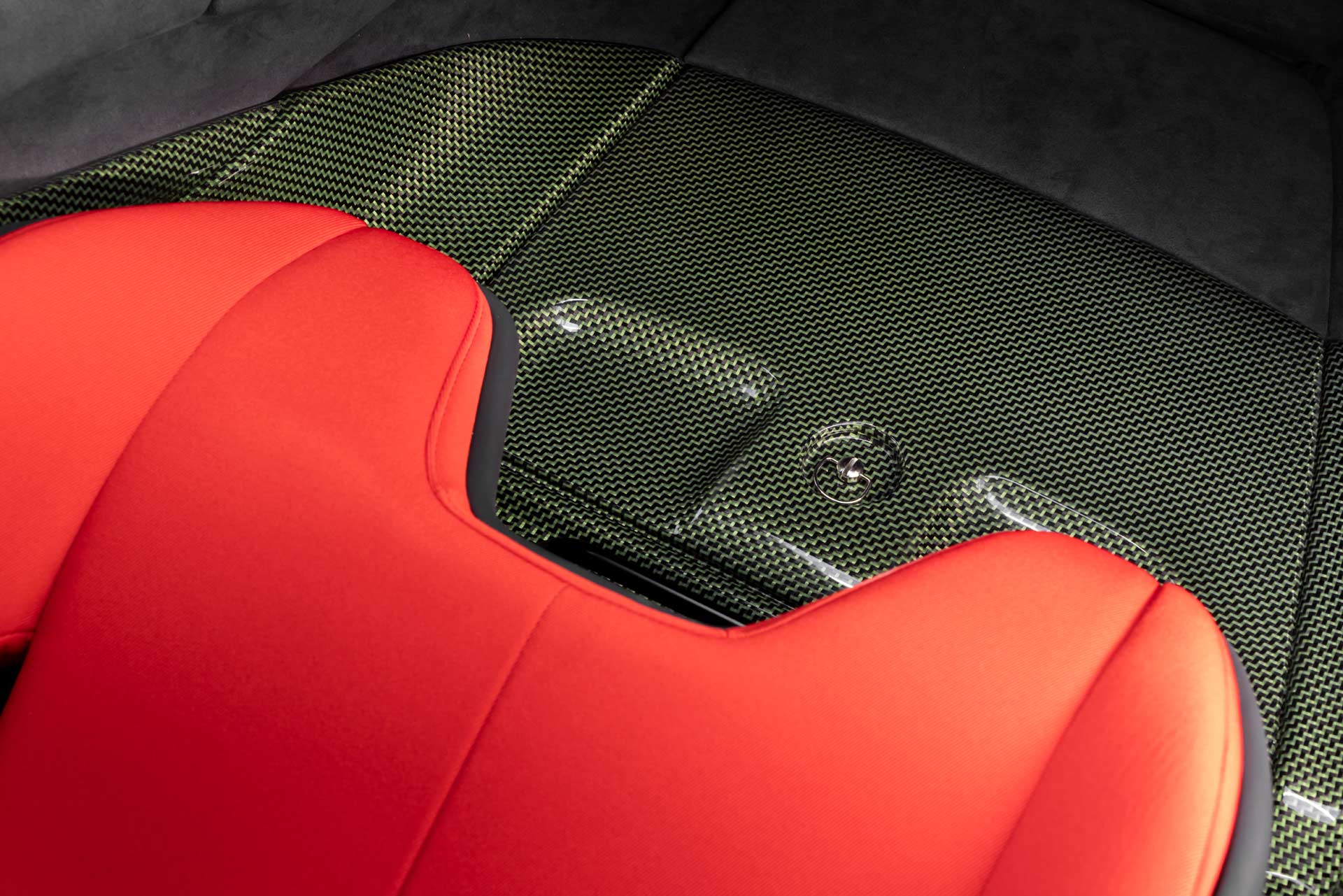 The interior design drew direct inspiration from the F40 through extensive use of Kevlar. The material was reinterpreted as carbon-Kevlar, used across the footwells, behind the seats, and within the floor mats. It also featured on the steering wheel, dashboard inserts, engine bay, and luggage compartment.