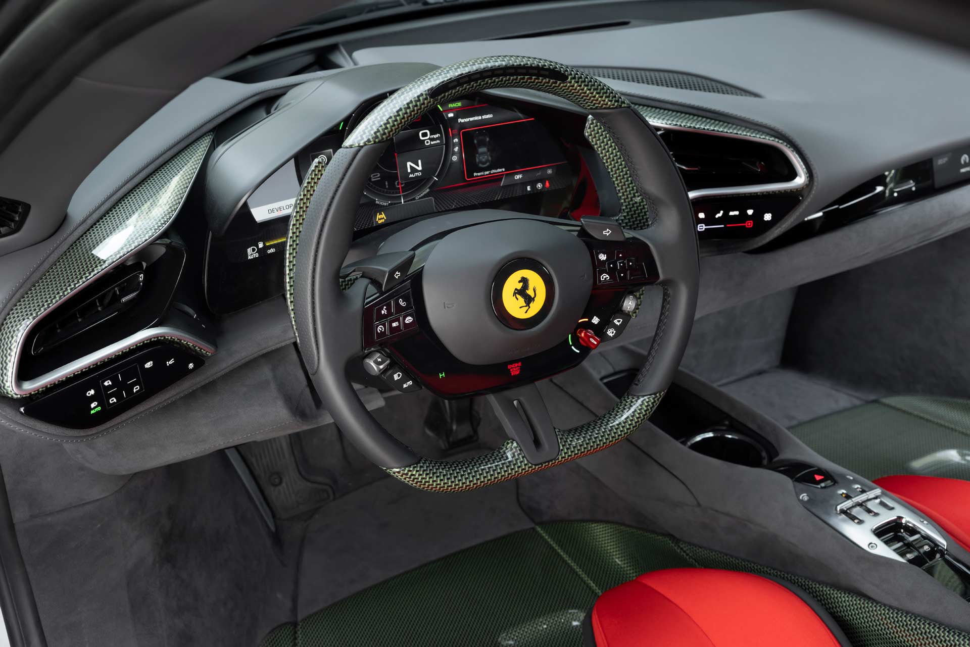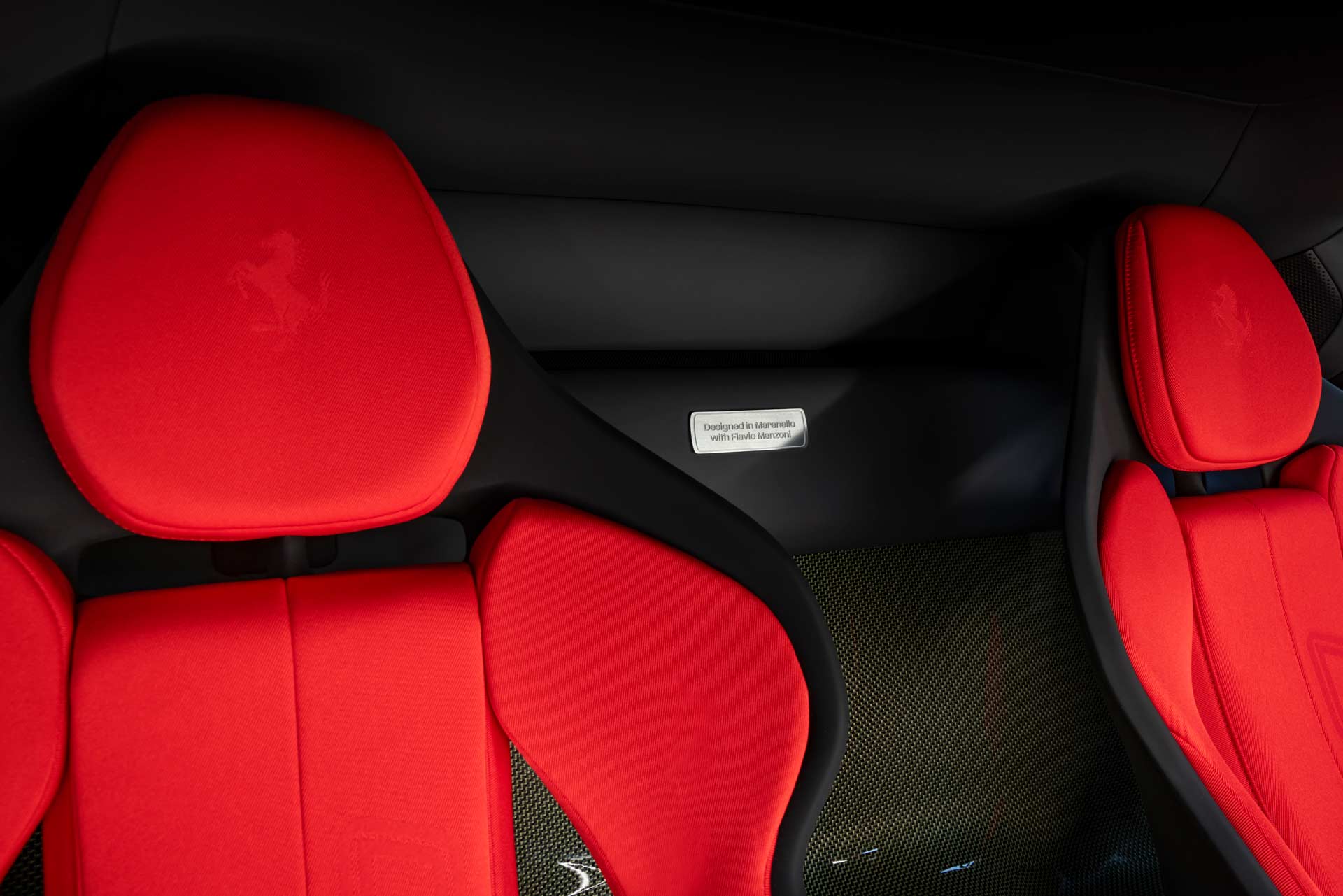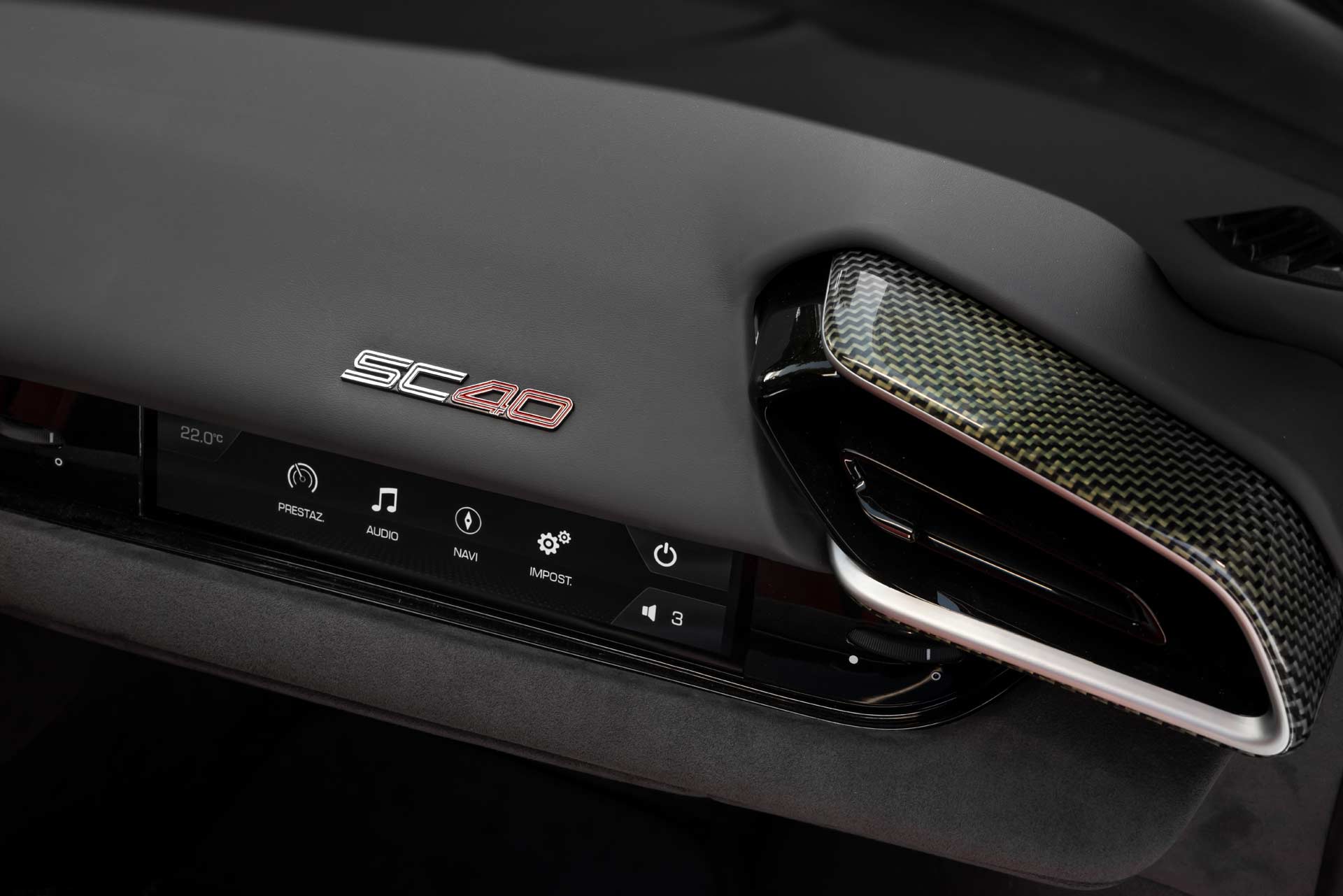 The cabin combined Charcoal Alcantara® and red Jacquard technical fabric upholstery, with embroidered Prancing Horse emblems on the headrests and woven SC40 logos. This created an atmosphere that blended heritage cues with contemporary craftsmanship.