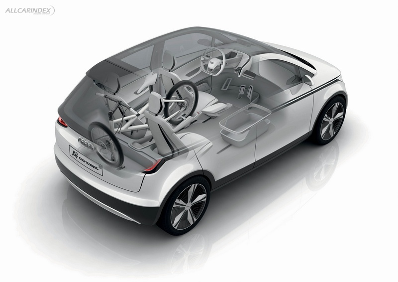 the audi a2 concept has a flat interior floorboard. the center console is attached to the driver's seat; the rear console extends forward between the two rear seats. the four individual seats add lightness, and there is storage space under the fold-up seat cushions. there is room between the rear seats for a city bicycle with its front wheel removed. the load area has two levels; a frame with functional nets creates the upper level.
