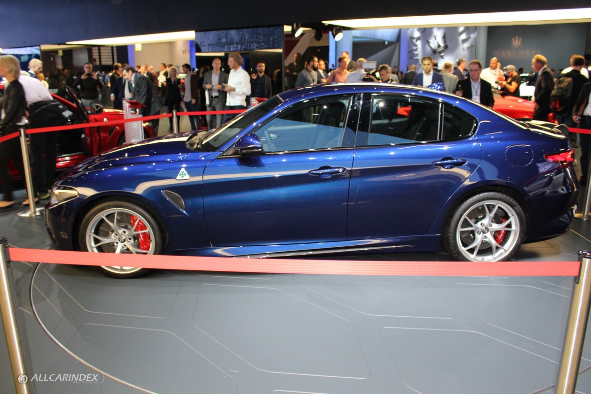 several examples of alfa romeo giulia will be on show in frankfurt, all sporting the quadrifoglio badge to indicate their premium nature with five liveries - competizione red, trofeo white, vulcano black, vesuvio grey and montecarlo blue - combined with leather and alcantara interiors.