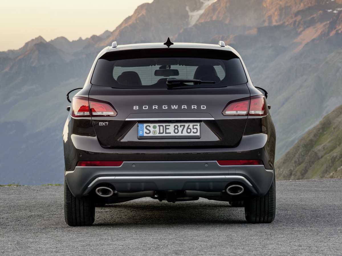 At the rear, the commanding chrome BORGWARD script is mounted between three-dimensional rear-light units, which consist partly of LEDs. The rear of the BORGWARD SUV has a horizontal alignment and, in combination with the vehicle’s broad wheel track, signalises its firm road holding capabilities together with excellent driving stability and superb lateral dynamics. The tapering greenhouse not only enhances the vehicle’s aerodynamic properties but also underscores its powerful shoulders and thus adds to its formidable presence. The upper part of the roof area is seamlessly connected to the rear body and culminates in a streamlined rear spoiler, which is positioned above the rear window and connected to the roof rails, as described above. The rear bumper is painted in the vehicle body colour and features a dual-flow exhaust system complete with square, chrome-edged outlets. As at the front, the vehicle rear features the high ground clearance and steep angle of approach characteristic of all true SUVs and therefore boasts the agility to master all kinds of off-road terrain.